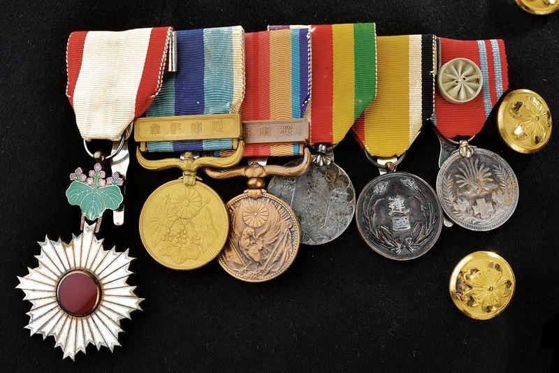KepÏ in tessuto nero con visiera, sul frontale il fregio dorato, completo di gradi in canutiglia dorata, pennacchio in piume di airone rosse e bianche. L'interno con alluda in pelle e cuffia in seta con iscrizione in giapponese. Lunga giacca in fine tessu