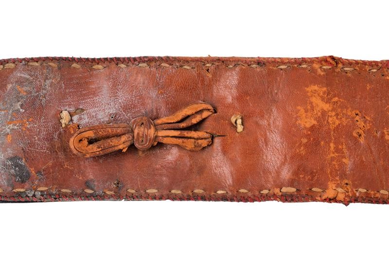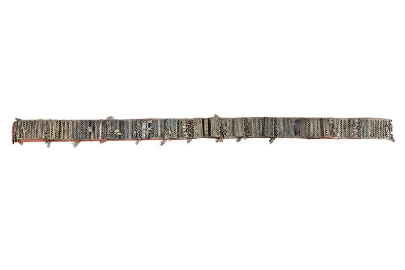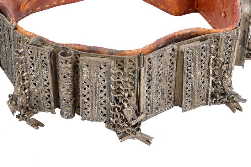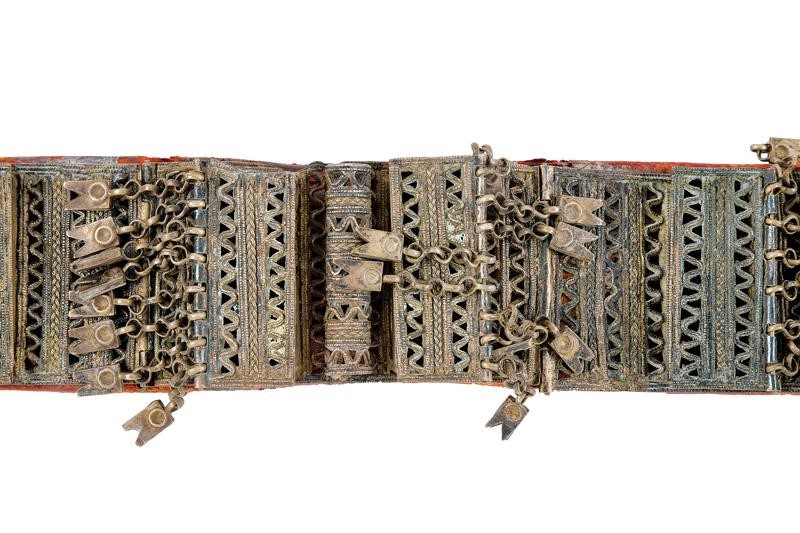 Cintura in pelle rossa completamente rivestita con fornimenti in argento, riccamente incisi, traforati e decorati con piccoli pendenti.