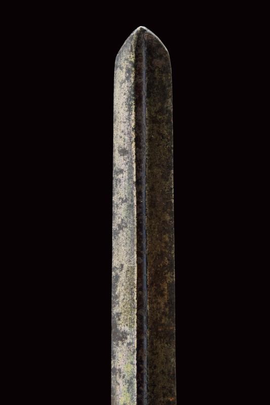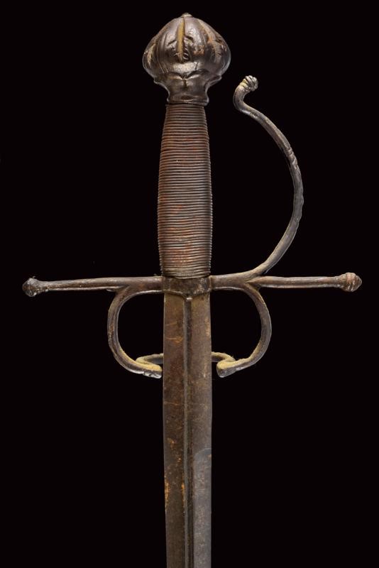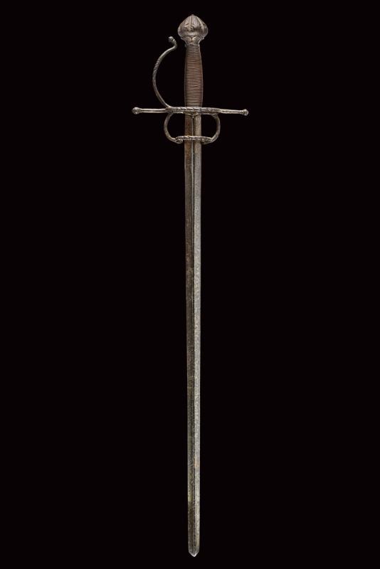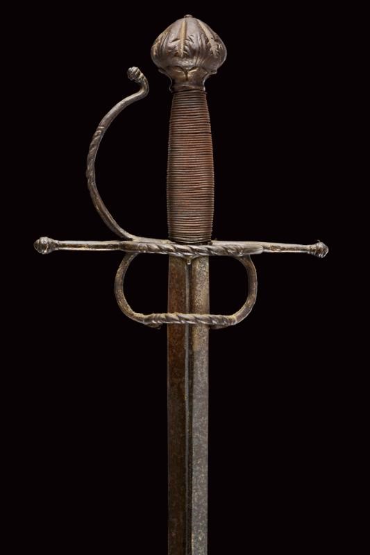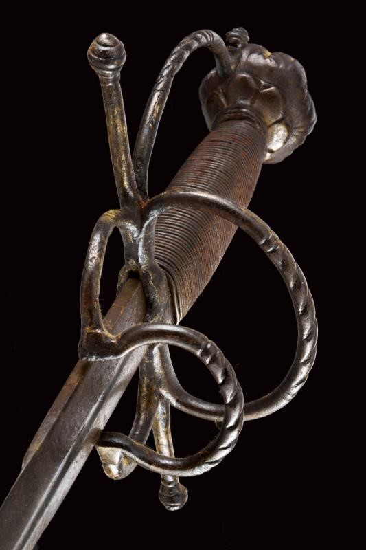 Lama dritta a due fili, leggermente accorciata, con sottile scanalatura in mezzeria. Fornimento in ferro con ponticello, l'anello di parata intagliati a spire come il ramo di guardia ed il ponticello, elso a bracci dritti con estremit‡ a boccioli. Grande