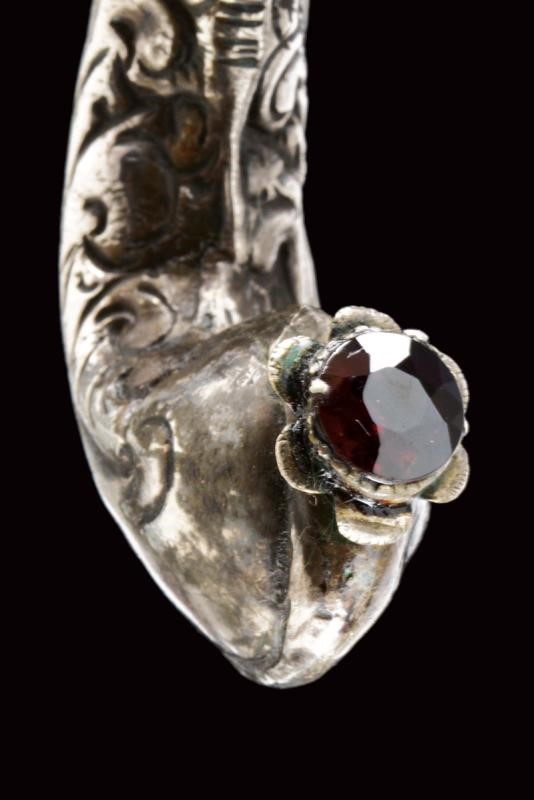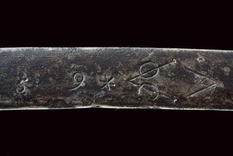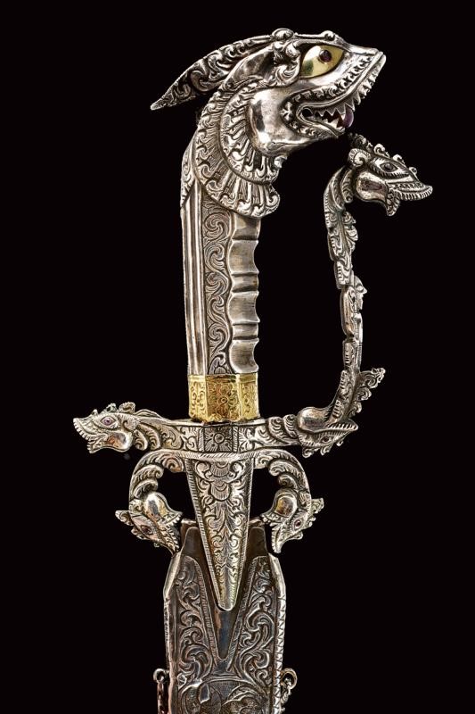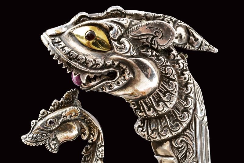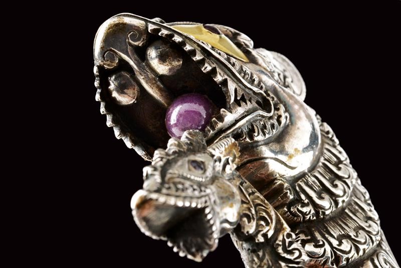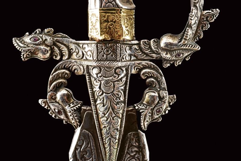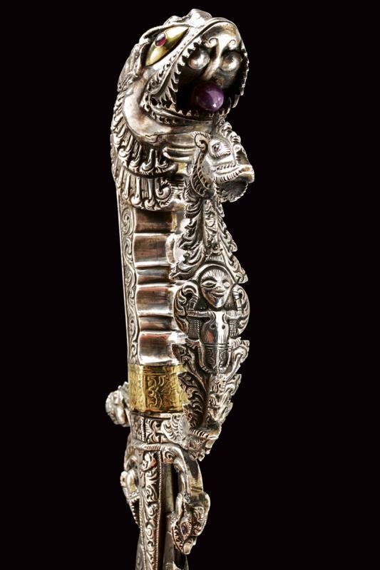 Lama in ferro, curva, a un filo, marcata su entrambi i lati "1759" e con punzone "V" con "O" e "C" sui bracci. Bellissimo fornimento in argento massiccio con alette fermafodero poste fra due archetti terminanti a testa di drago, gli occhi con rubini intag