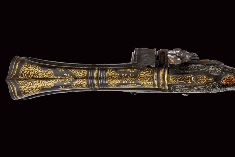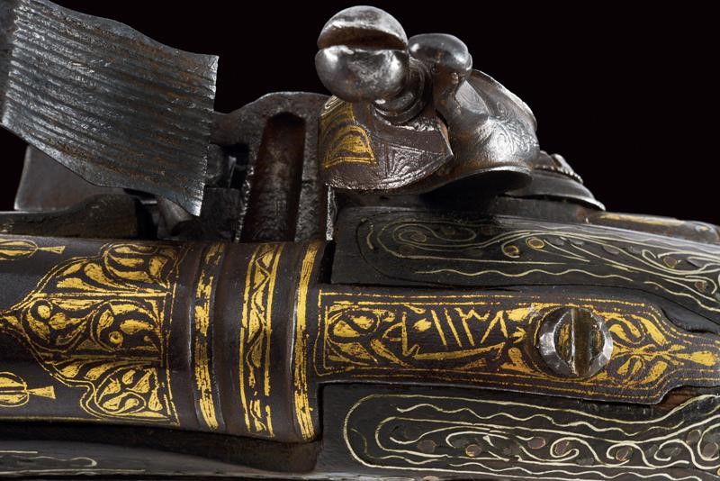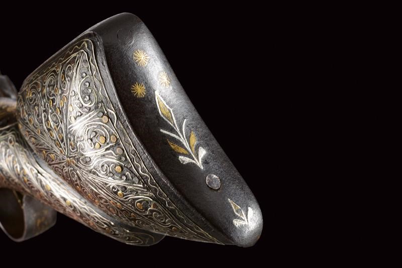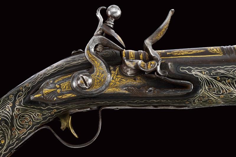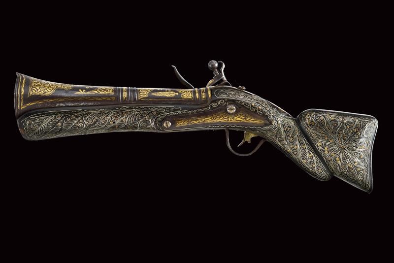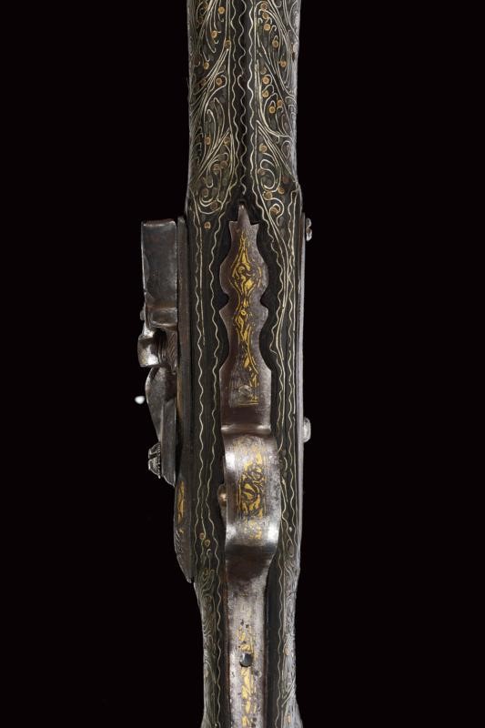 Canna tonda liscia, con base quadra, recante alle estremit‡ ed al centro scanalature ed anellature, arricchita per tutta la lunghezza da decorazioni in oro. La volata con fortissima strombatura leggermente cuspidata alla sommit‡ per fingere un mirino. Cod