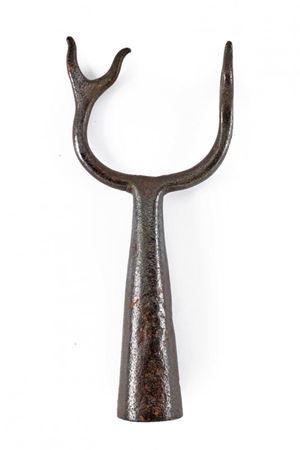 In ferro con cuspide a "U", le due estremit‡ con biforcute, per la miccia. Gorbia troncoconica. Raro.