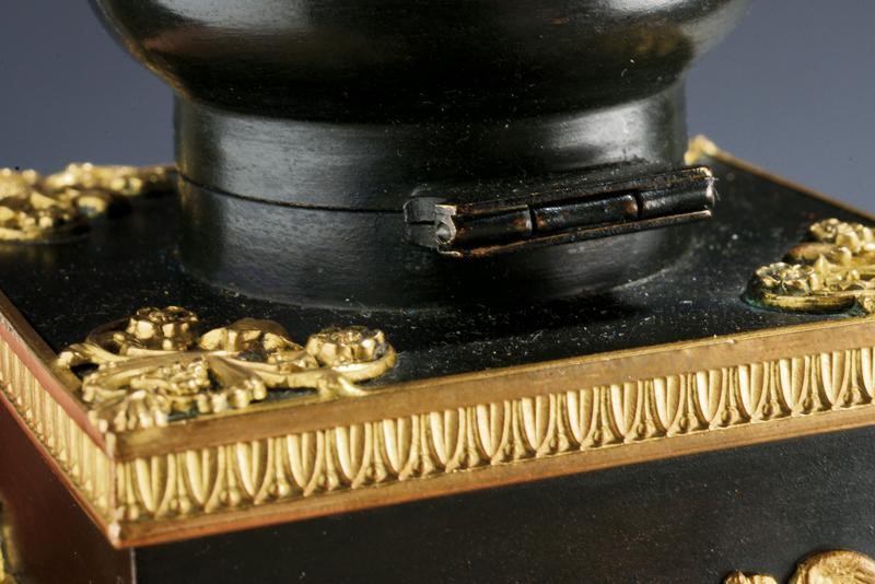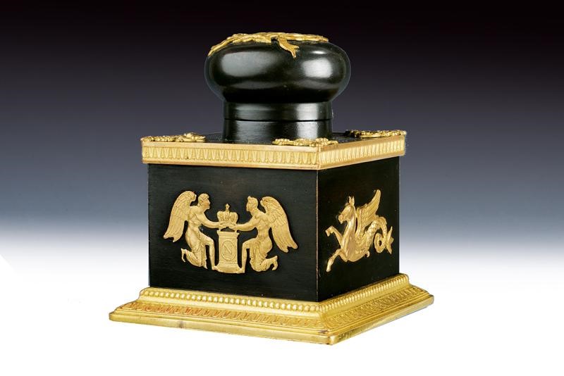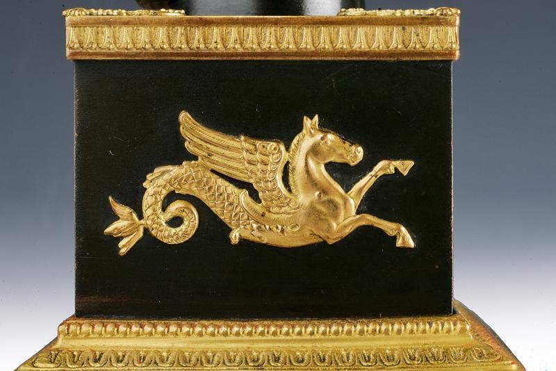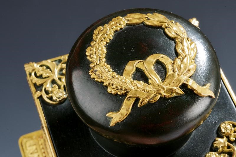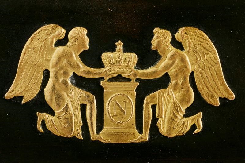 In bronzo parzialmente annerito con fornimenti dorati in ottone, finemente incisi e traforati. La faccia anteriore con due angeli che reggono la corona di Napoleone sopra ad pilastro con il monogramma "N". Sui lati un cavallo alato e con coda di drago. Mo