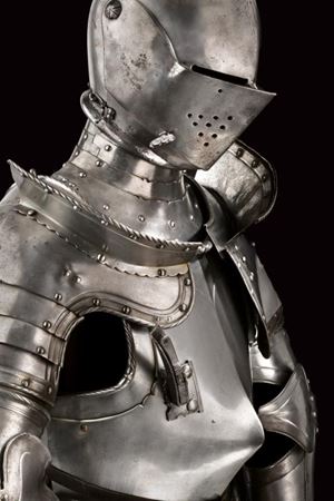 Pesante elmo ad incastro, con coppo in un unico pezzo munito di cresta con incisioni a linee e sommit‡ tondeggiante; vista rialzabile con cresta lavorata en suite con il coppo e con fessure oculari rettangolari, ventaglia appuntita e costolata munita di f