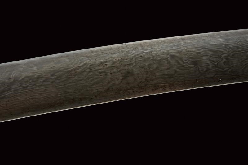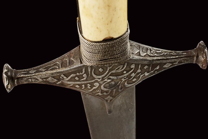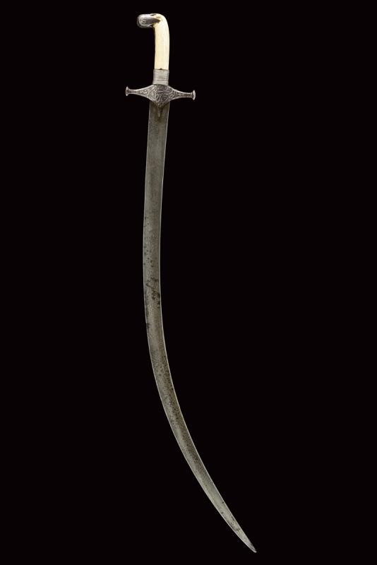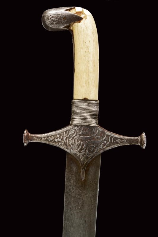 Lama piatta curva, a un filo, in bel damasco chiaramente visibile, con piccole aree recanti danni da ruggine. Fornimento in ferro con elso a croce intagliato con iscrizioni in caratteri arabi. La cornice dell'impugnatura con resti di decorazioni in oro. G