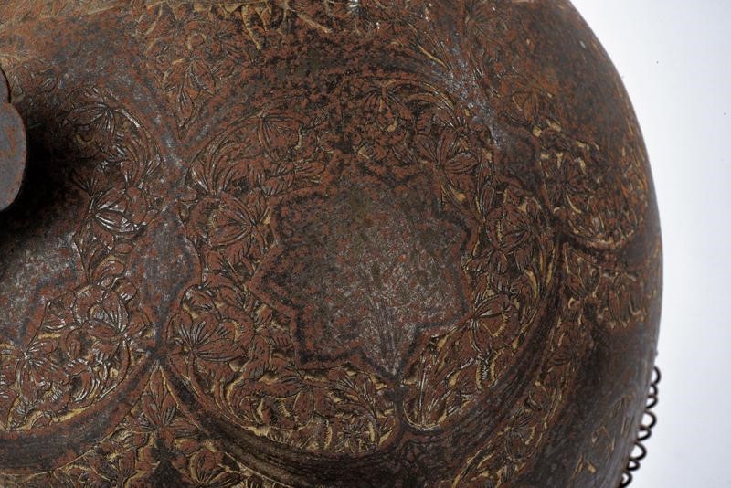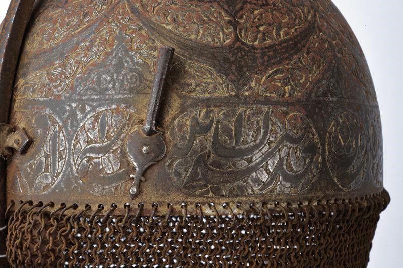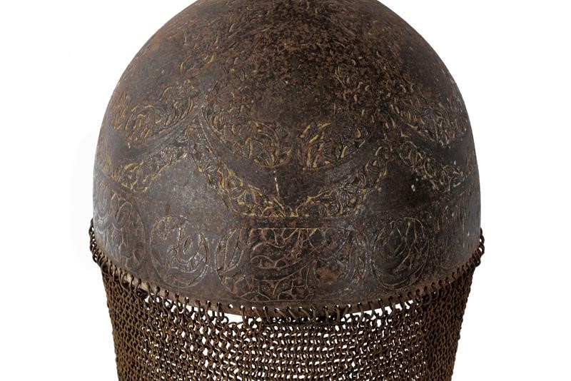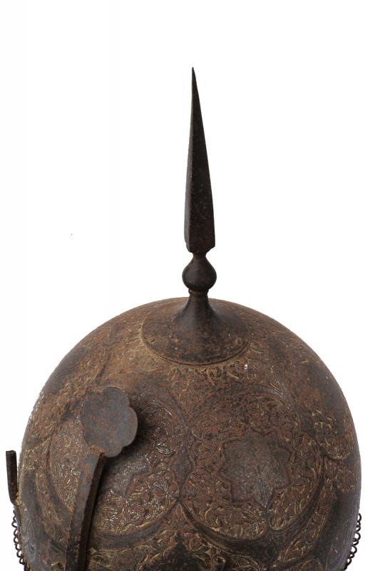 In ferro, con coppo emisferico; alla sommit‡ una cuspide su base troncoconica, protezione nasale scorrevole affiancata da due pennacchiere. La superficie del coppo incisa, parzialmente argentata a motivi floreali, recante al bordo iscrizioni in caratteri