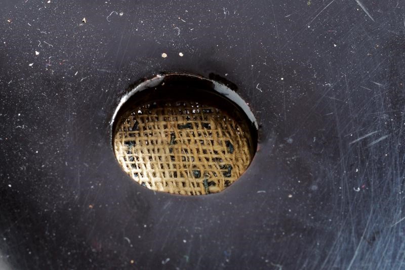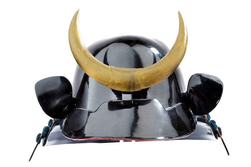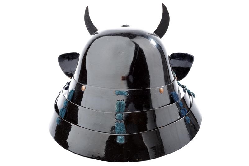 Coppo in cuoio rigido Nerikawa, laccato nero con tehen semplice. Maedate a mezzaluna in metallo con tracce di doratura. Anche mabizashi fukigaeshi laccati neri en suite. Shikoro a tre lame allacciate sugake in color blu. Interno con cuffia in tela blu e r
