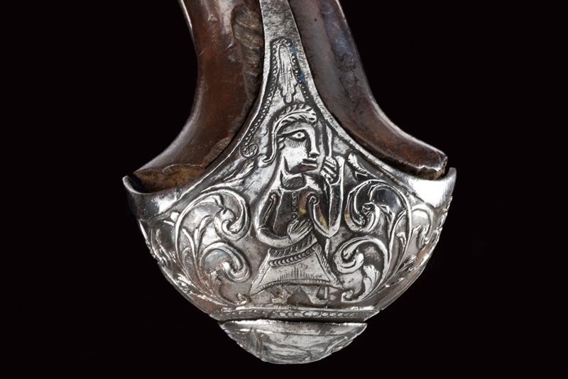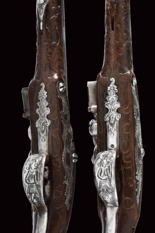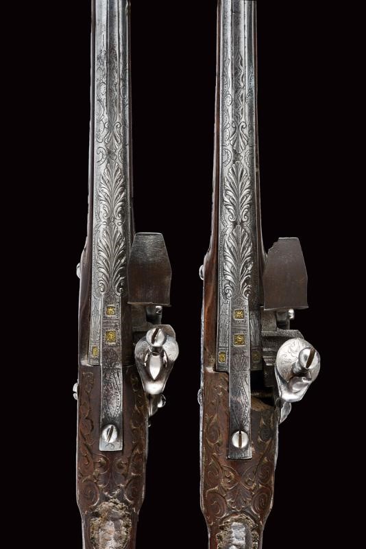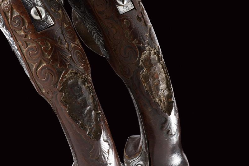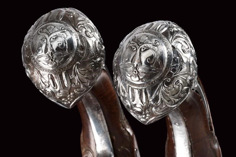 Bellissime canne lunghe, lisce, tonde con base quadra, munite di quattro punzoni rimessi in ottone, di cui quello al centro con "DP CV" sotto braccio con spada, i tre intorno con "DP" speculari sotto corona. La prima parte delle canne con intagli ed incis