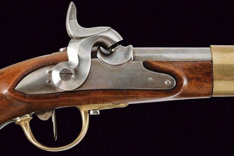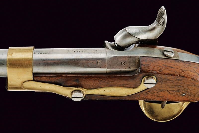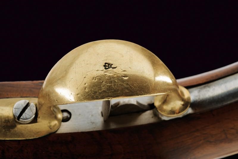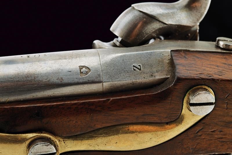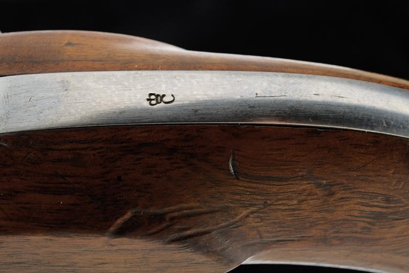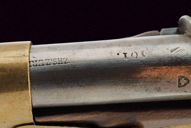 Canna tonda liscia, numerata "101.", punzonata con croce elvetica entro scudo, marcata "ZHS. ZURI..", con timbro "Z". Cal. 17,7 mm. in volata. Batteria priva di marcature. Meccanica funzionante. Cassa a tre quarti in legno. Fornimenti in ottone. Punzone a