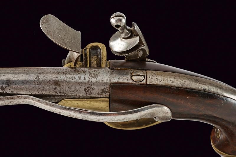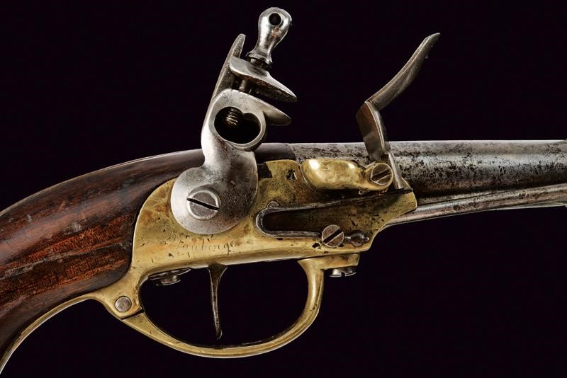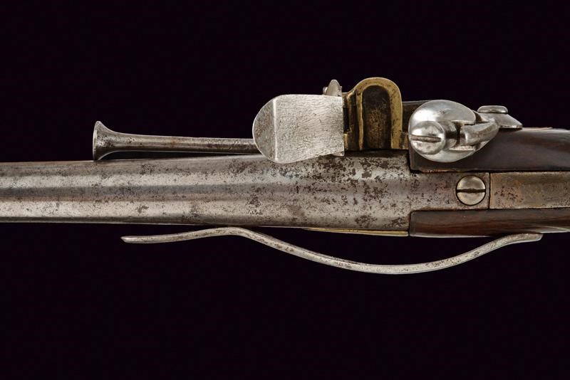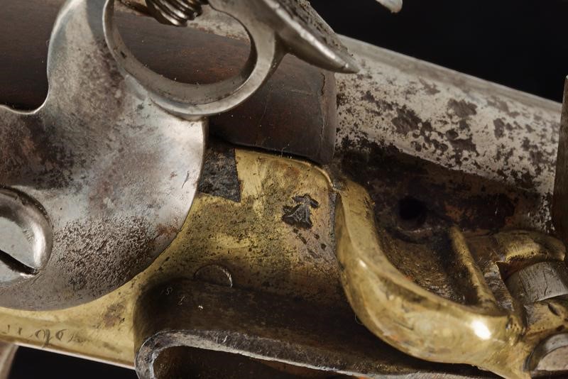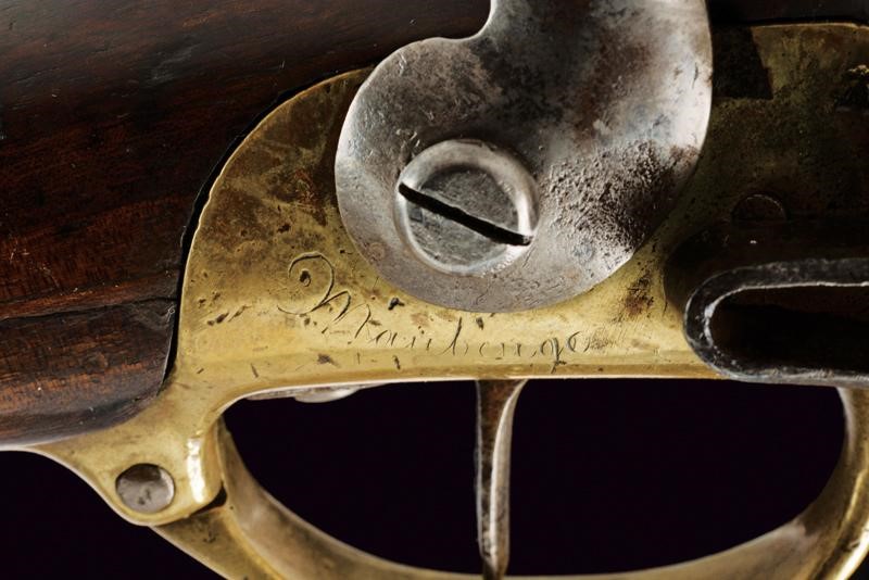 Canna tonda liscia, con qualche intaccatura, cal. 18 mm. in volata. Tipico castello in ottone con resti di marcatura "Maubeuge". Cane, martellina e molla in ferro. Meccanica funzionante. Calcio in legno con coccia in ottone. Gancio da cintura in ferro. ma