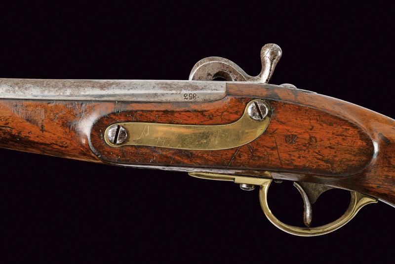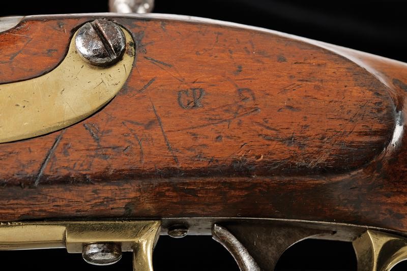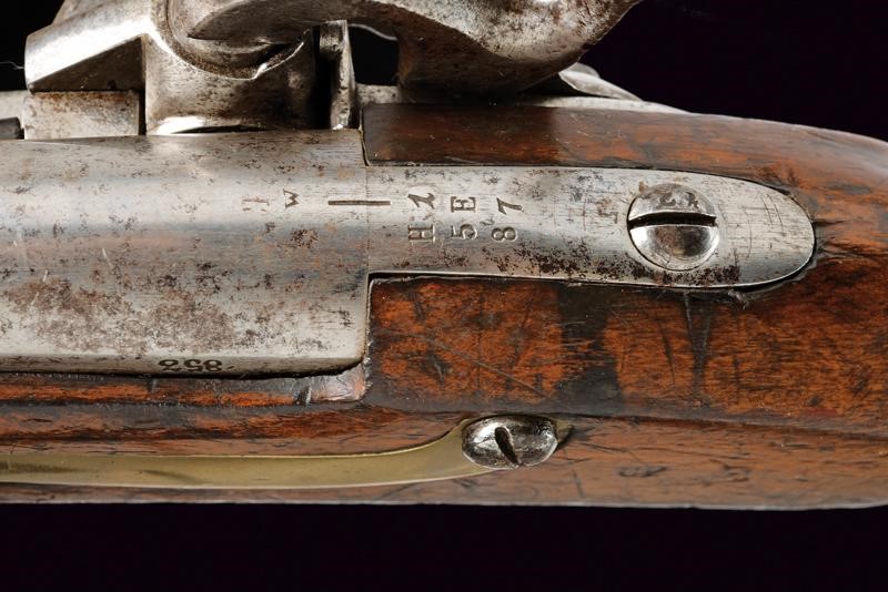 Canna tonda liscia recante alla base tracce di un marchio non leggibile e una "W", inoltre la data "853" sul fianco sinistro e tracce di altri punzoni su quello destro. Cal. 17,1 mm. in volata. Codolo con marcatura "H1 5 E 87". Batteria con sistema august