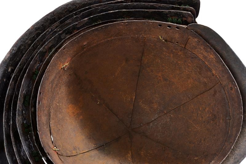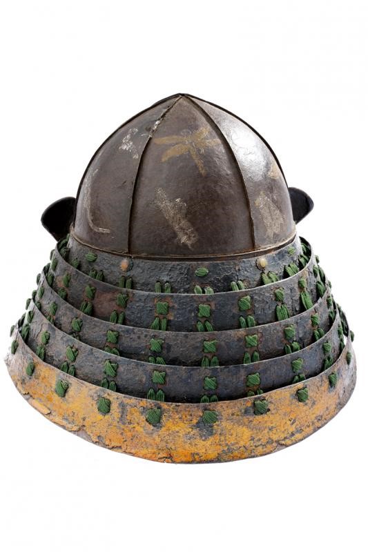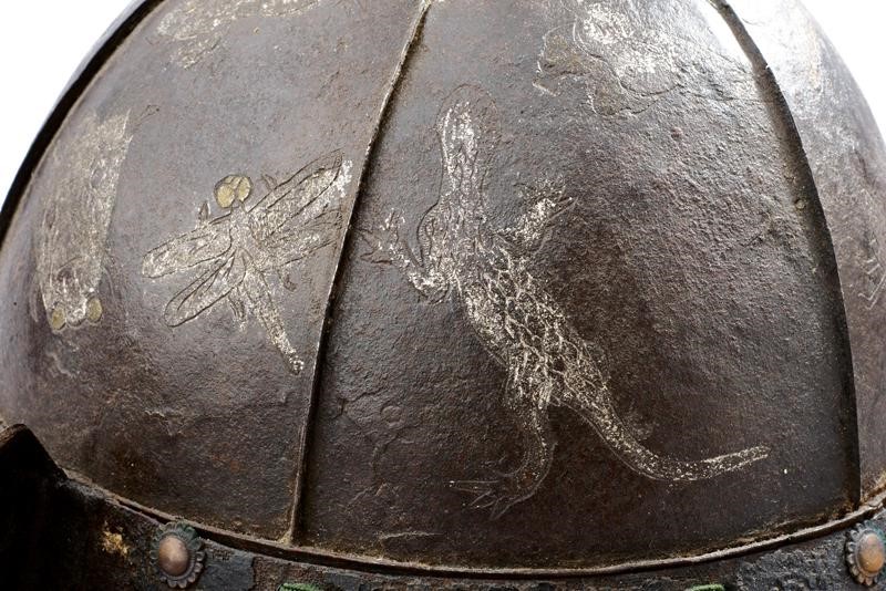 Hachi in ferro a sei piastre decorate con animali rimessi in argento, rame e ottone. Shikoro a 5 lame in lacca nera, l'ultima in lacca oro come pure i piccoli Fuchigaeshi. Allacciatura in seta verde nello stile sugake.