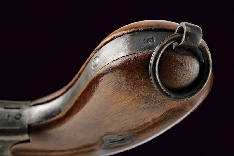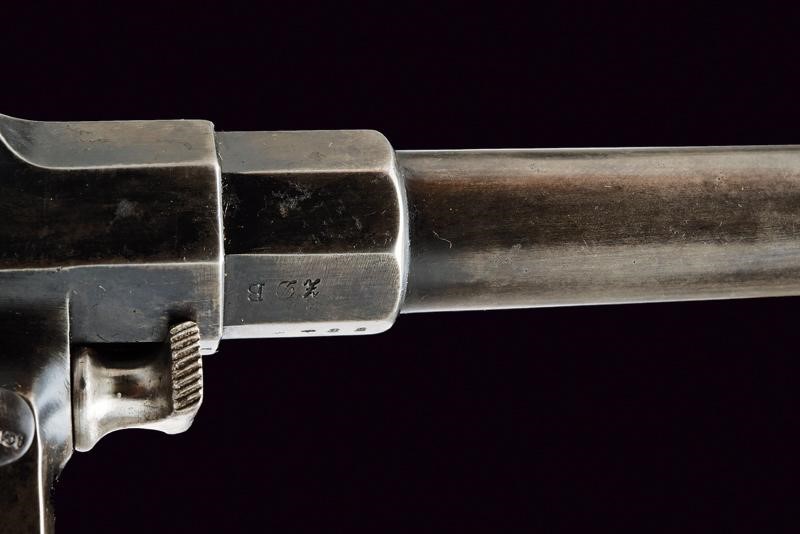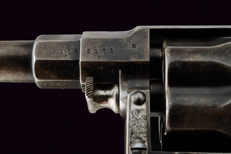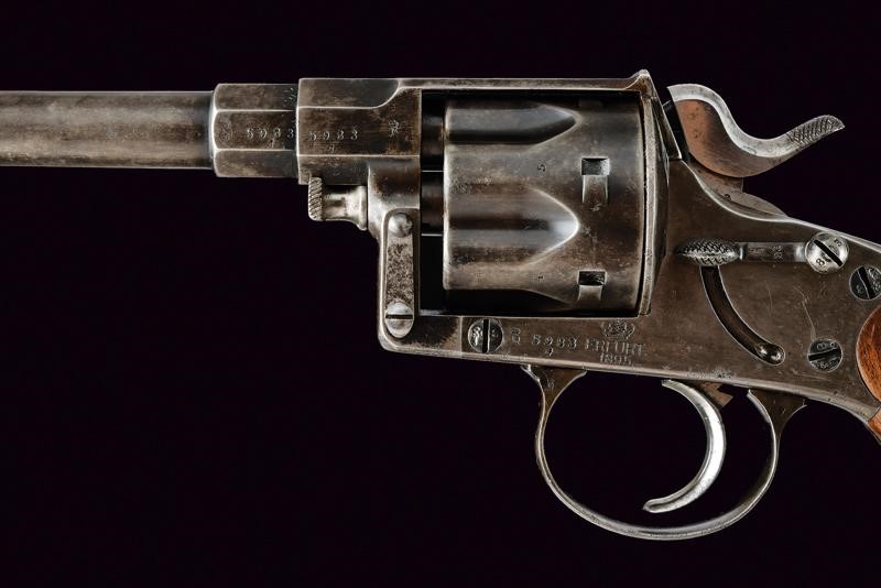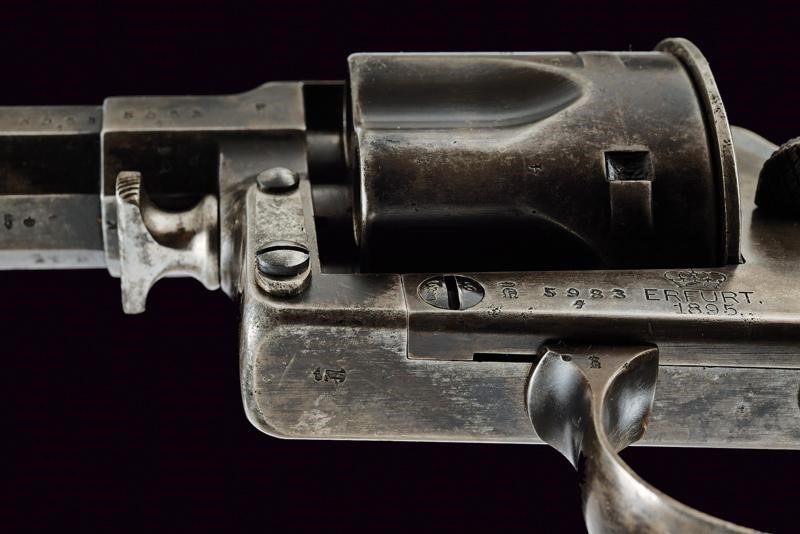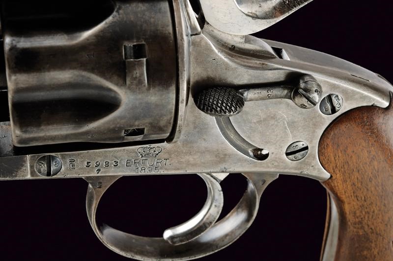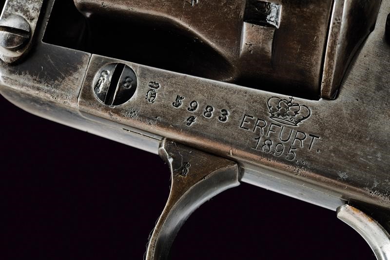 Canna tonda rigata (anima pulita, rigatura visibile, qualche segno d'uso), con base ottagonale, dotata di mirino, recante numeri di serie e punzoni, cal. 10,6 mm. Tamburo scanalato, a sei colpi. Castello in acciaio marcato "ERFURT 1895" e con corona. Matr