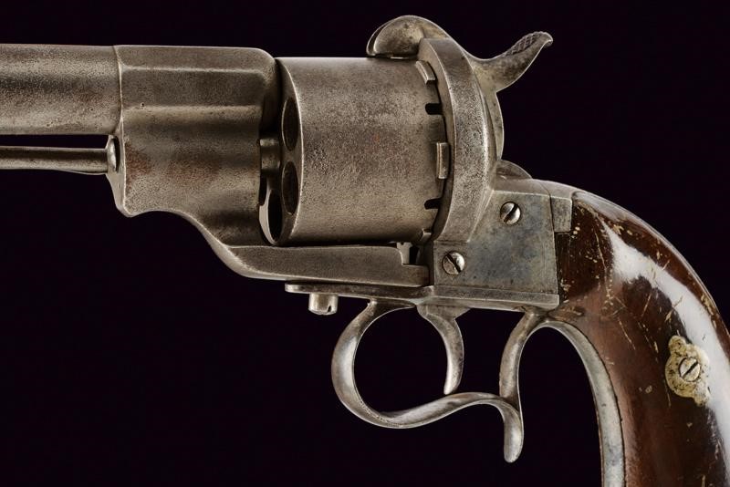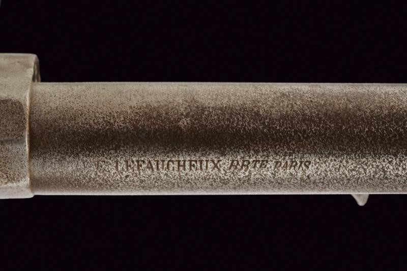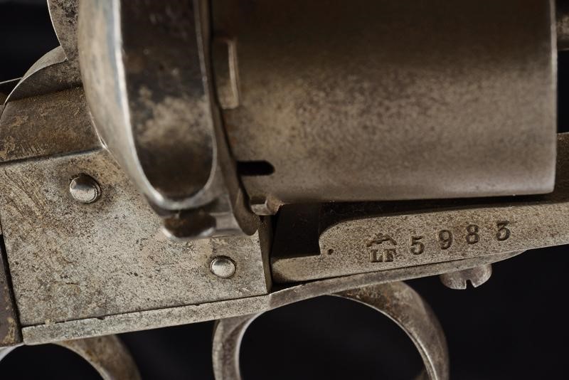 Canna cilindrica rigata (anima pulita, rigatura visibile, qualche intaccatura all'interno), dotata di mirino, recante al dorso resti di marcatura "E. LEFAUCHEUX BR.TE PARIS", cal. 11 mm. Tamburo a sei colpi. Punzone di Lefaucheux "LF" con matr. "59xx". Im