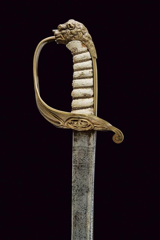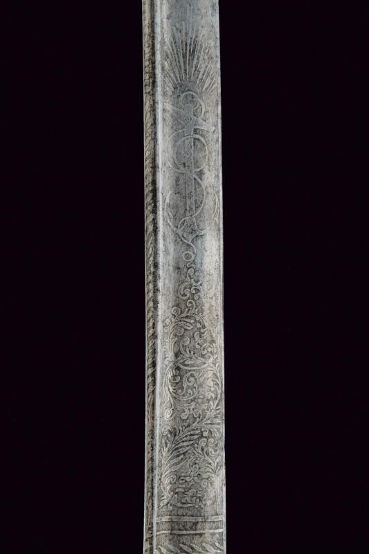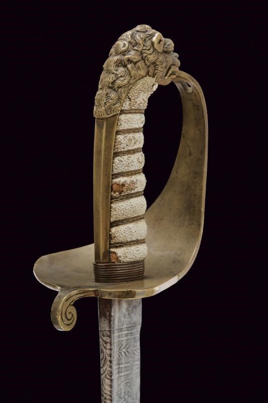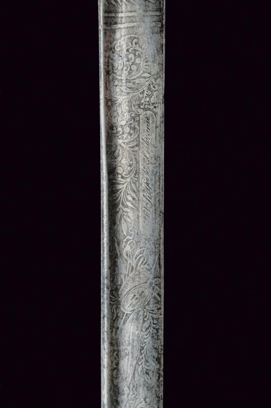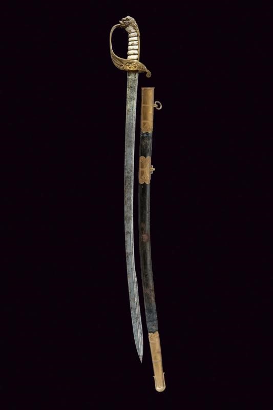 Lama curva a un filo, punta e breve controfilo, con dorso a bacchetta, recante al forte resti di incisioni a racemi, trofei e con un'ancora. Su un lato firma e data "1861 Napoli Labruna". Fornimento in ottone con ampia guardia recante aquila sabauda coron