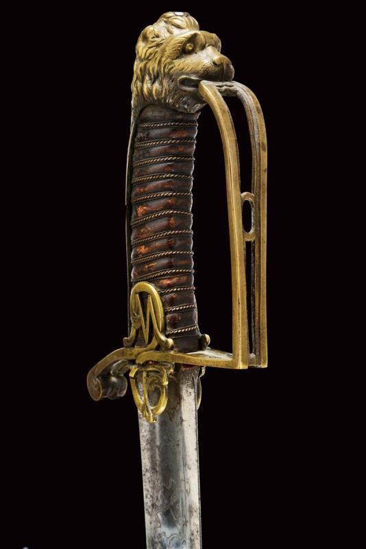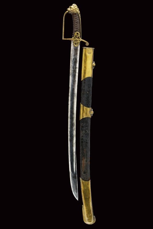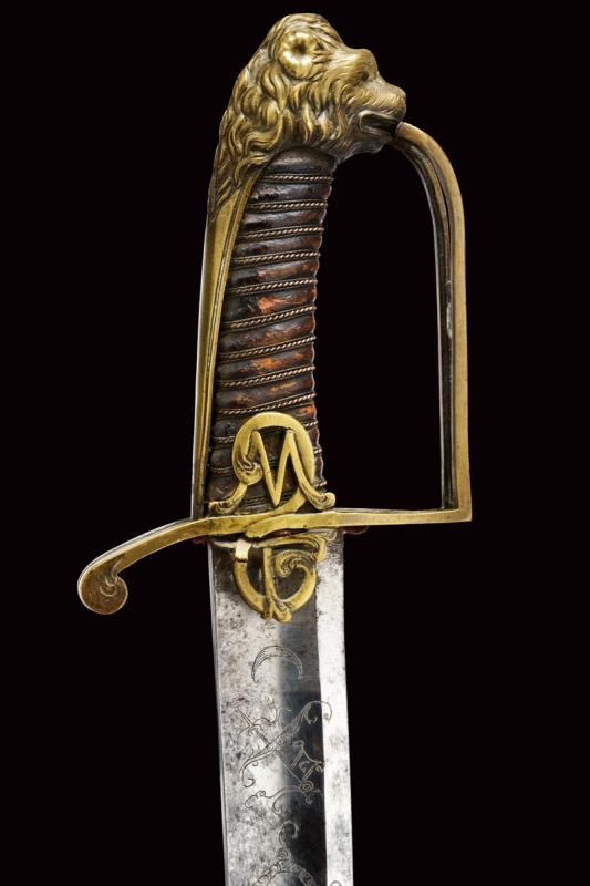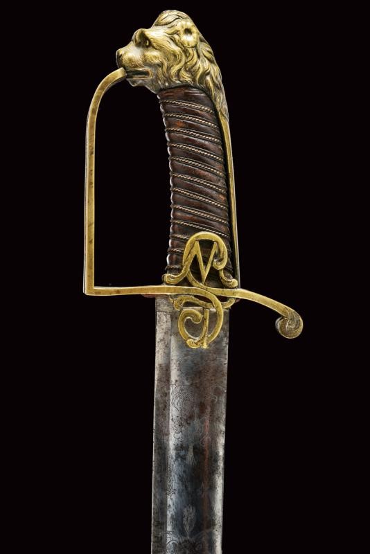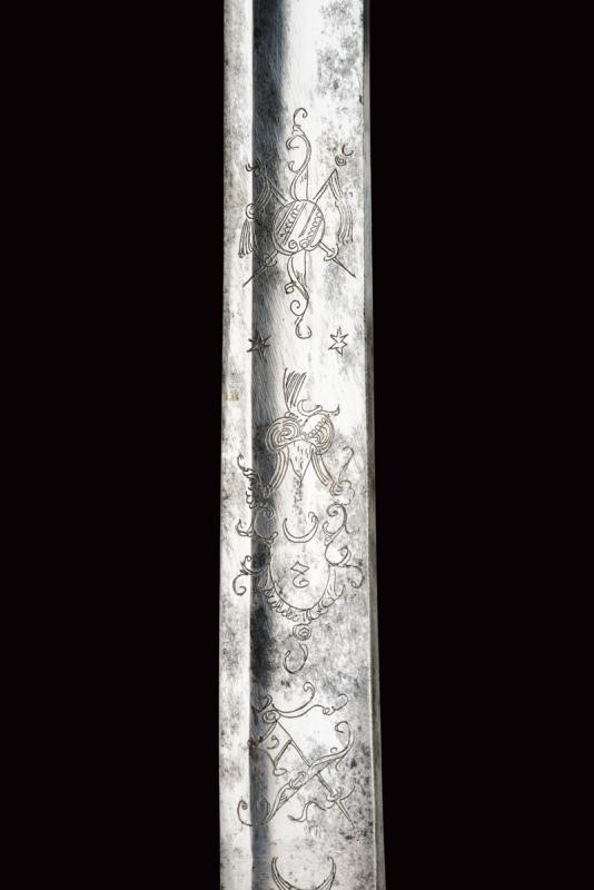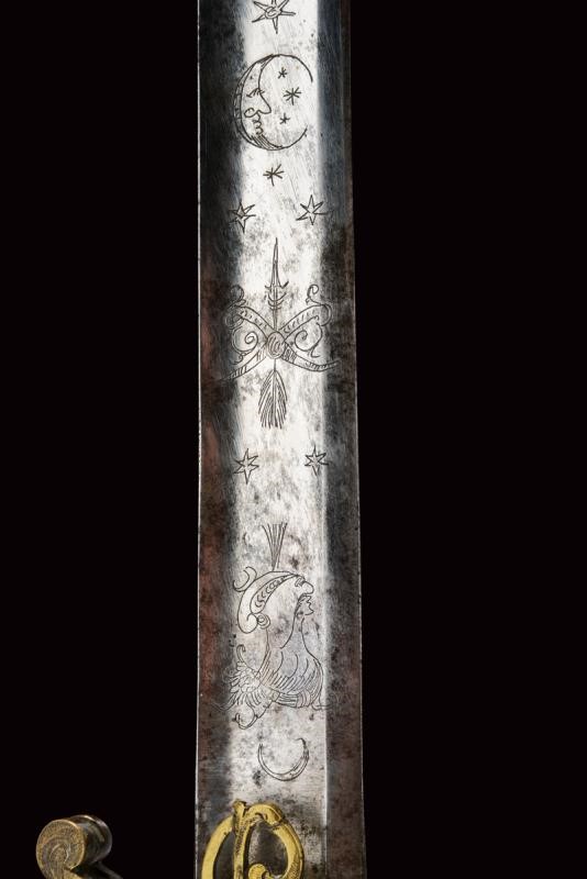 Ampia lama leggermente curva, sgusciata, a un filo e controfilo, incisa al forte su una faccia con mezzaluna antropomorfa e stelle, trofeo con freccia e ritratto di un Pandur, sull'altra con un trofeo con scudo e lance, un cartiglio ed un secondo trofeo c