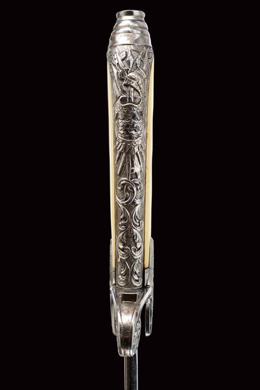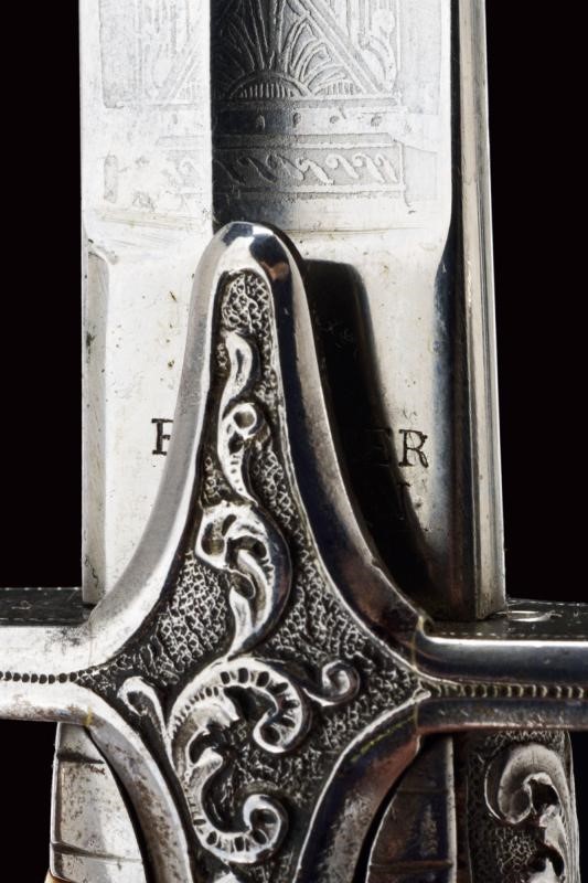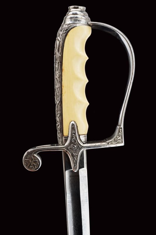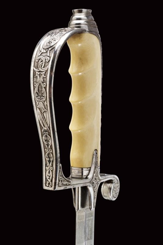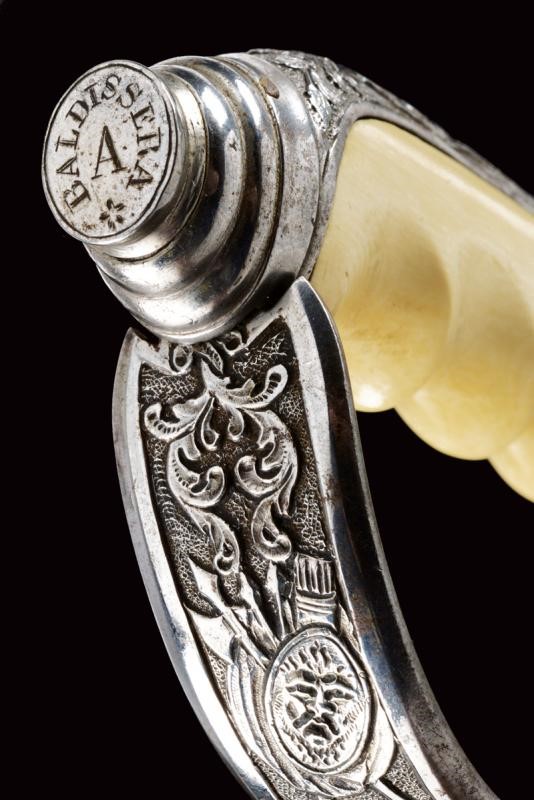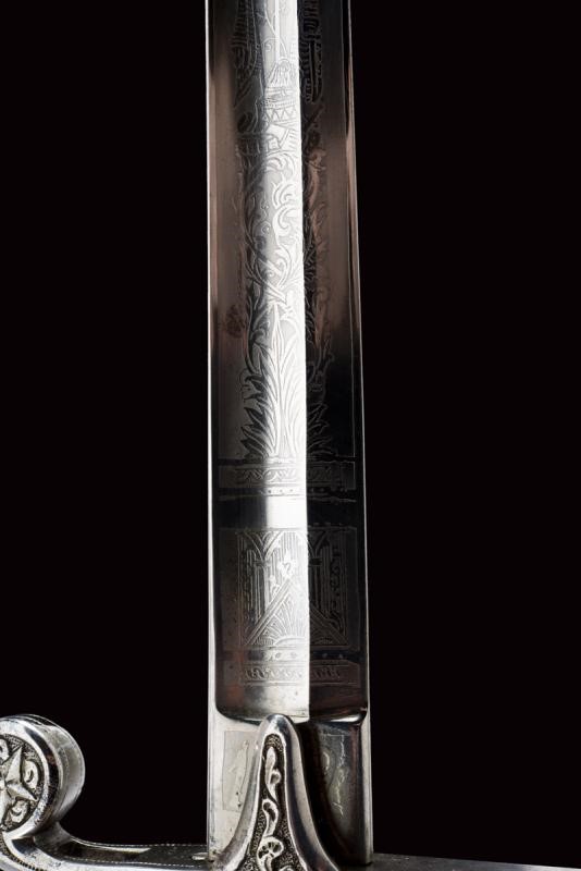 Lama leggermente curva a un filo e controfilo con ampio sguscio centrale che si sdoppia al debole. Incisa per tutta la lunghezza dello sguscio, recante la dedica "In Segno Di Riverente Stima E Di Affetto", su un lato e "I Sottufficiali Del 22∞ Fanteria" s