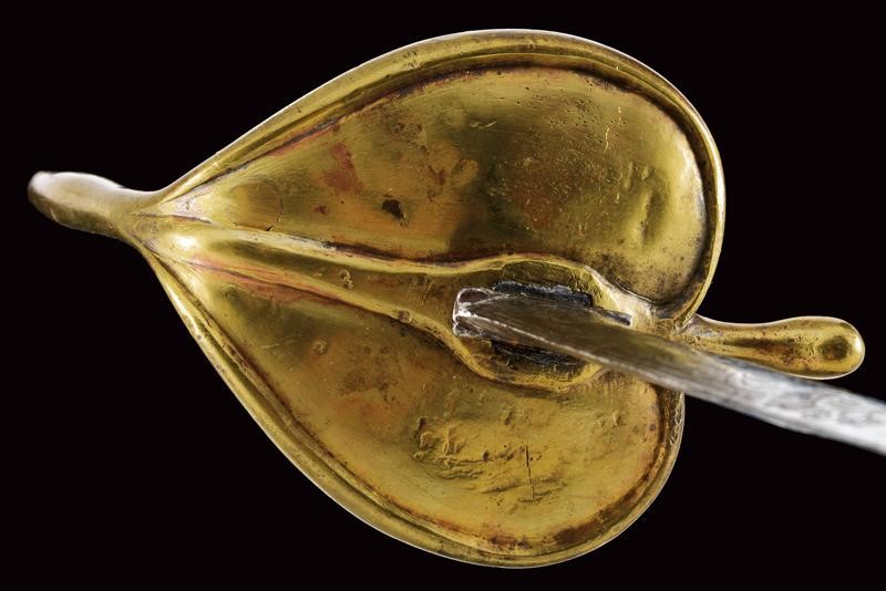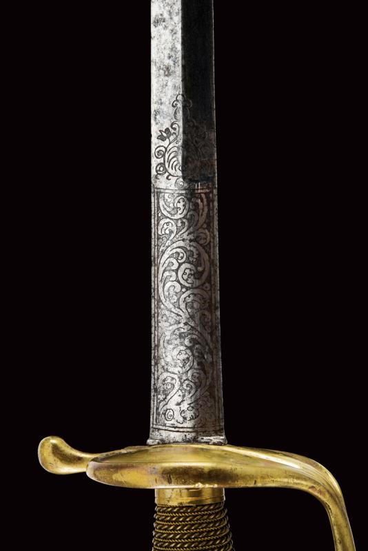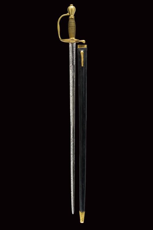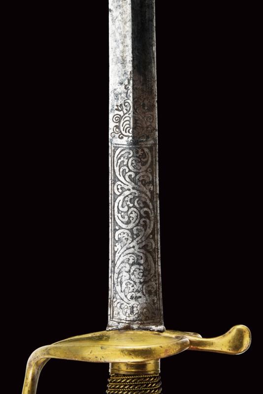 Lama dritta a due fili di sezione a losanga, la prima parte lenticolare e finemente incisa a motivi floreali su fondo scuro. Fornimento in ottone con valva a cuore, corto braccio di parata, ramo di guardia e pomo a urna. Impugnatura in legno rivestito di