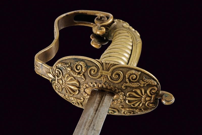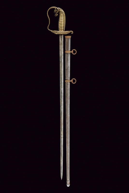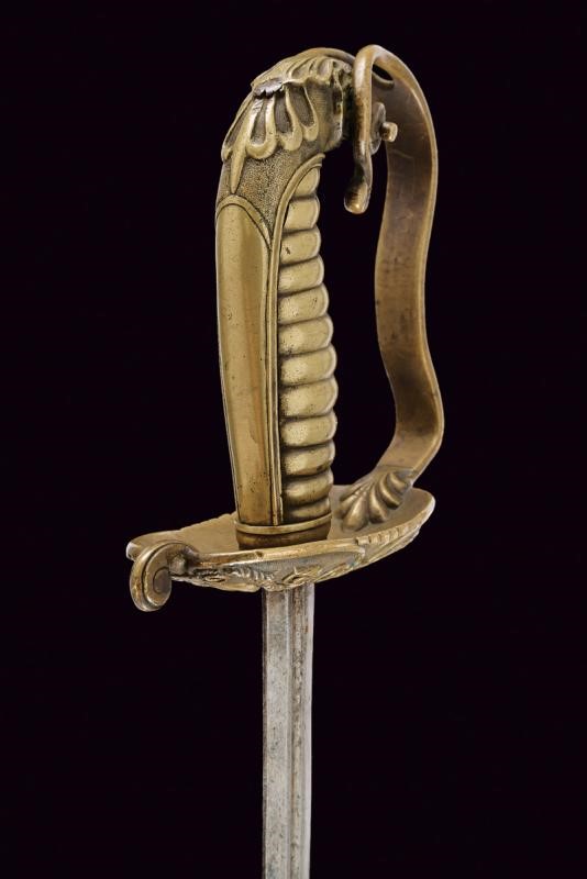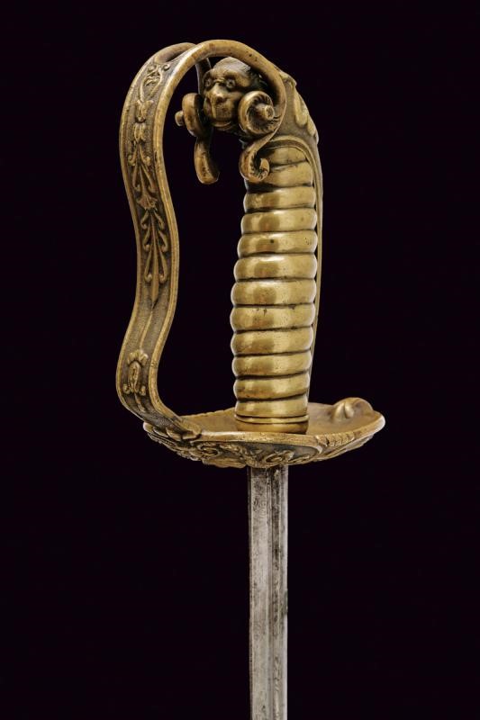 Lama dritta a due fili di sezione esagonale, con breve sguscio al forte. Fornimento in ottone con coccia decorata a motivi floreali in rilievo, guardia biforcuta. Impugnatura in ottone con cappetta culminante a testa di leone. Fodero in ferro con fornime