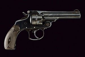 Canna tonda rigata, con alta bindella recante brevetti sino al 1877, cal. 32 S&W. Tamburo a cinque colpi con con doppia fila di scanalature. Guancette in gommadura zigrinata e con monogramma della ditta. Matricola "12xxx" coeva su canna, gancetto e impugn