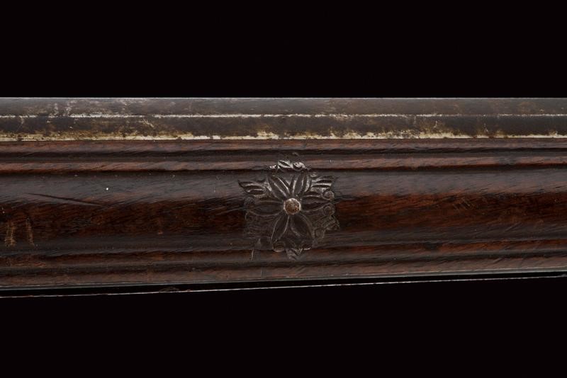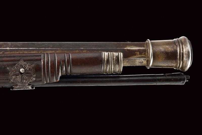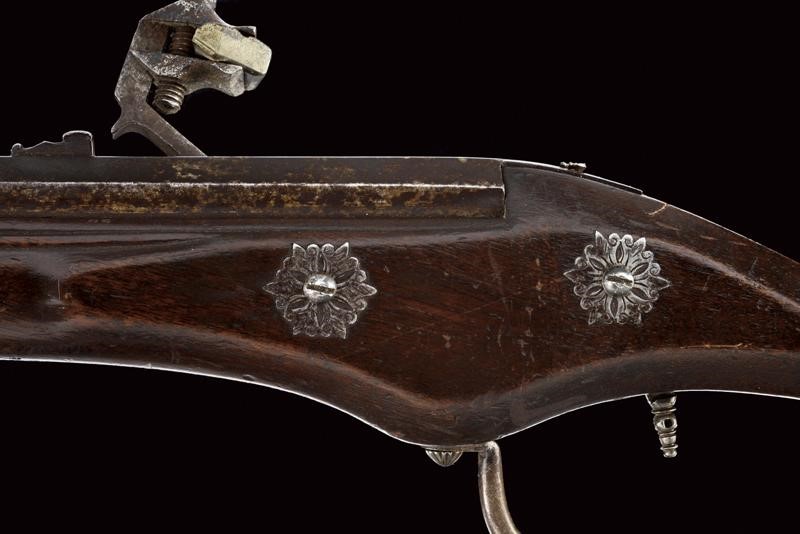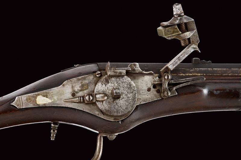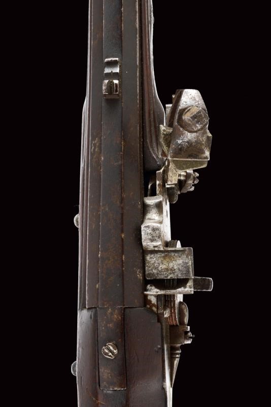 Canna ottagonale con piccola sforatura vicino alla volata e gioia di bocca con strombatura a campana di forma circolare. Tacca di mira fissa. Batteria a ruota di gusto tedesco con piastra liscia. La vite di perno del cane parzialmente sfilata. Cassa in le