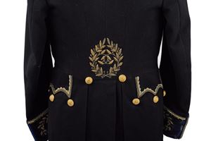 Feluca in castorino nero con bande marezzate, piumetto color nero, bottone dorato con fregio papale in rilievo che tiene la ganza in velluto nero ricamato con fronde di lauro in filo dorato in rilievo, la coccarda in tessuto bicolore; interno con fascia e