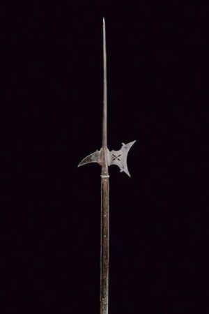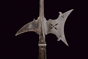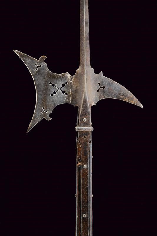 Ferro con lunga cuspide a quadrello, la scure a taglio incavato con gobbe (profonda crepa al collo) e decori a sforature circolari e a segmenti; il becco incurvato verso il basso con cuspide leggermente ingrossata, decorato en suite. Munita di lunghe bandelle apparentemente integre e anche delle controbandelle. Ghiera in ferro. Montata su asta lignea di sezione quadra di produzione non recente, con restauri e numerosi fori di tarlo.