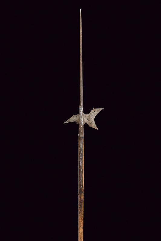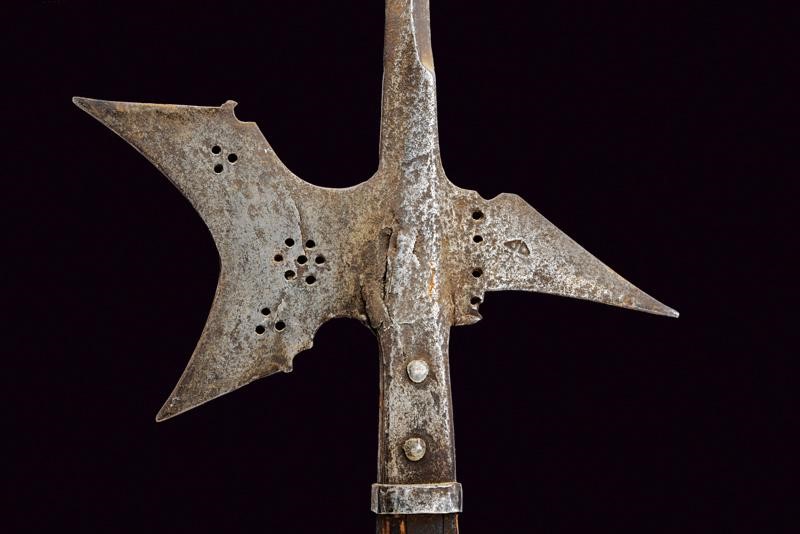 Ferro con lunga cuspide a quadrello leggermente allargata alla base, scure fortemente incavata con gobbe ai dorsi e sforature circolari (crepa e danni al collo della scure), becco leggermente incurvato e con resti di punzone. Bandelle dritte, con ribattini in ferro, ben incassate. L'asta lignea di produzione non recente.