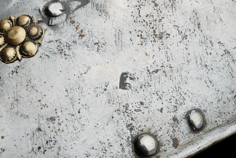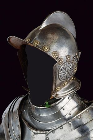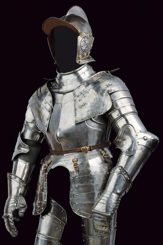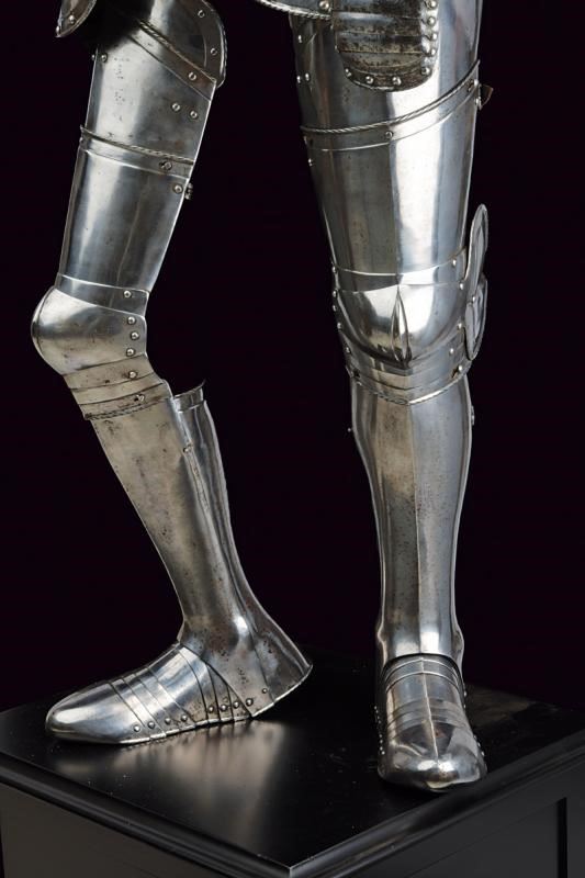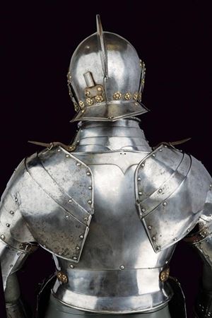 Borgognotta lavorata in due pezzi con cresta di media altezza, tesa appuntita, guanciali con rosetta sbalzata e sforature, pennacchiera di rimontaggio. La base dell'elmo e i guanciali con rivetti in ottone muniti di rosetta. Interno in patina con tracce di tintura rossa e resti di vecchia imbottitura. Gola con padiglioni a tre lame, quelle superiori con scollo rilevato e lavorato a fingere il tortiglione. Bel petto costolato in mezzeria con spigolature nella parte superiore, dotato di tapul ben rilevato; lo scollo, come anche i giri ascellari, con spesso cordone lavorato a fingere il tortiglione. Vicino allo scollo resti di un punzone. Due lame di falda e scarselle a sei lame (vari ribattini di restauro). I coietti con rosette in ottone. La schiena con simile spigolatura a "V" del petto, lavorata in quattro pezzi. Bracciali Interi con grandi spallacci (una vecchia riparazione all'ala anteriore) muniti entrambi di resti di un marchio. Cubitiere con rosetta sempre sbalzata al centro. Belle manopole a mittene, con manichino con margine ribassato e decorato a "V" con bordo lavorato a fingere il tortiglione; dorsi a cinque lame, mittene a tre lame. Gambiere con cosciali a tre lame con bordo alzato e lavorato a fingere il tortiglione, ginocchielli con aletta, la lama centrale sbalzata in mezzeria. Schiniere sane con scarpe a otto lame probabilmente di epoca successiva. Montata su bel manichino appositamente elaborato.