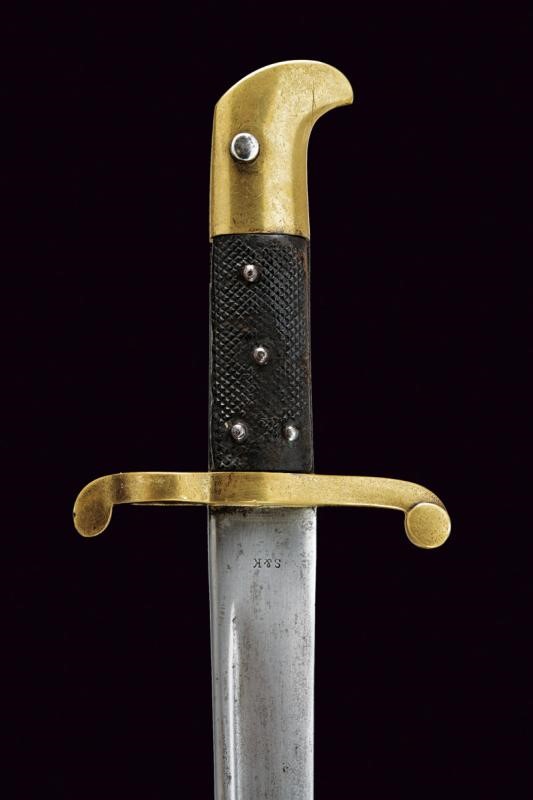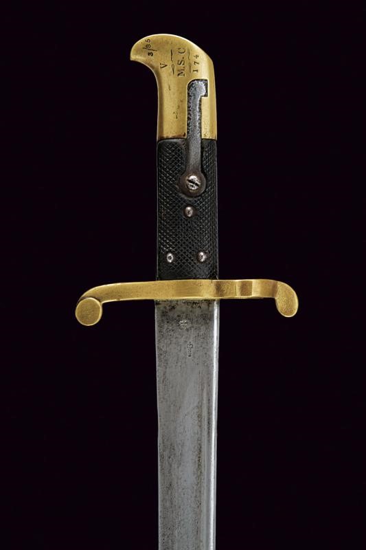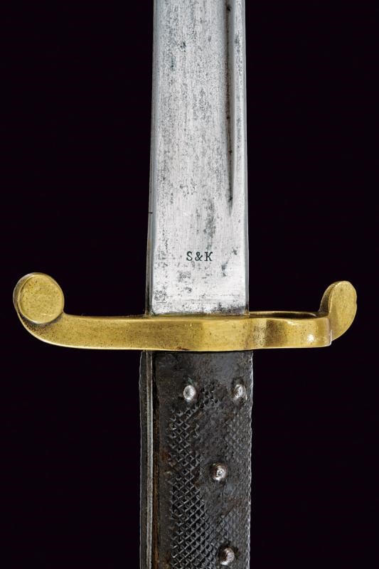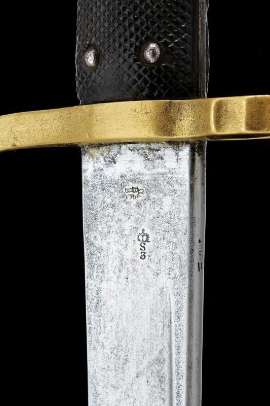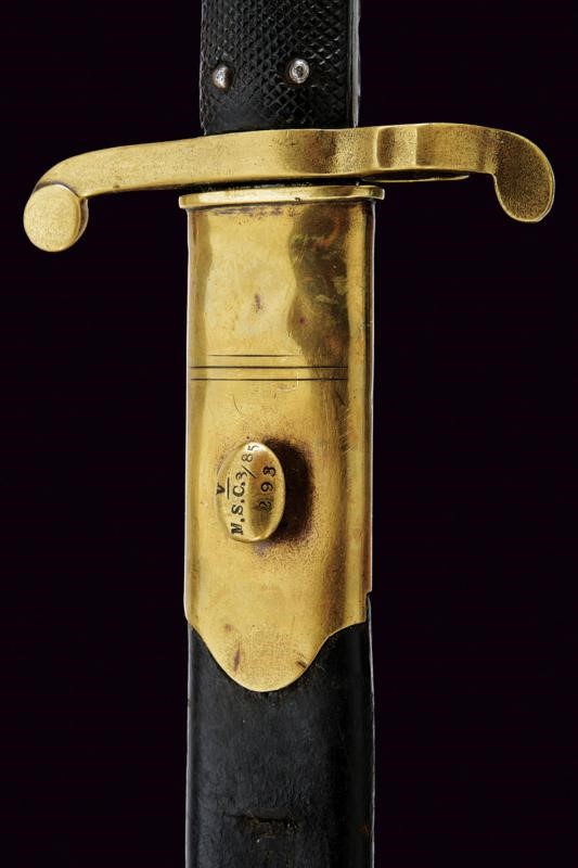 Lama con jelman e punzoni alla base "S&K", "S3" sotto corona e con un altro marchio. Fornimento in ottone (numerato) con guancette zigrinate. Con fodero in cuoio e fornimenti in ottone, il pomo marcato "M. S. C." (corpo sanitario), "174", "V" e "3/85". Fodero in cuoio con fornimenti in ottone, il bottone marcato "M. S. C. 3/85", "V" e "293". Molto rara.