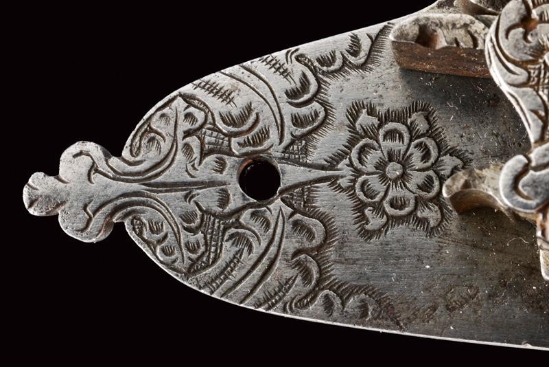 Cartella piatta di forma ancora arcaica finemente incisa a motivi floreali. Il cane scolpito con un cuore stilizzato ed inciso en suite come anche le coperture delle molle e la martellina.