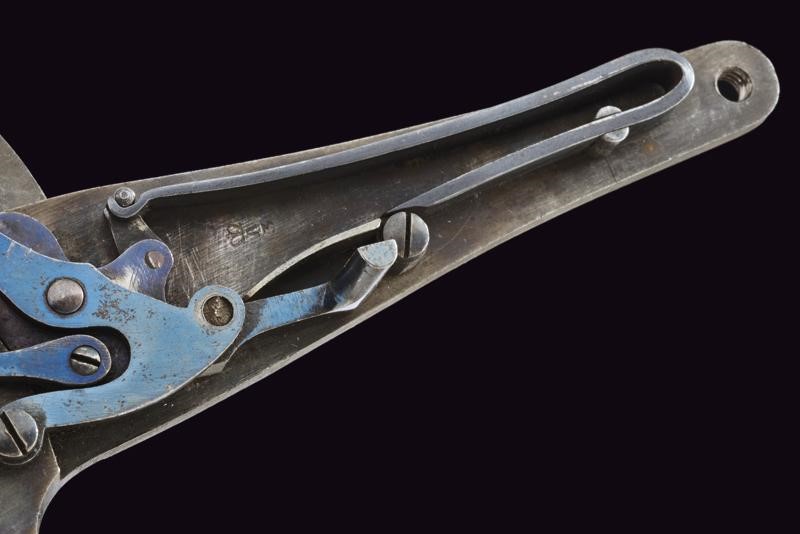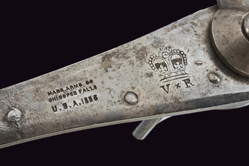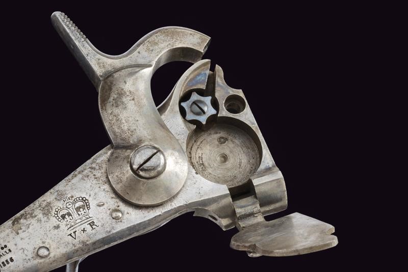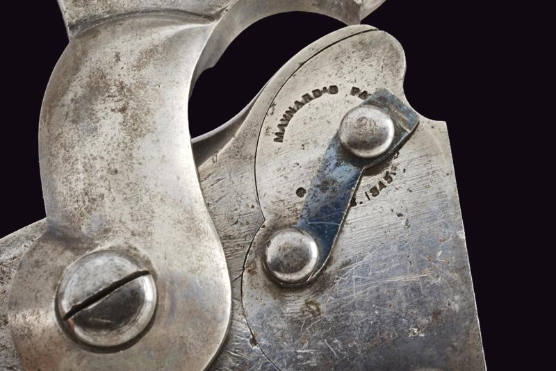 In ferro, con meccanica funzionante. Il blocco anteriore con scomparto per nastro di inneschi, il coperchio marcato "MYANARD'S PATENT" e con brevetto del 1845. La cartella con corona britannica sormontante "VxR" e con marcatura del produttore statunitense e data del 1856. Punzone britannico sul retro. Alcune componenti interne conservano parte della brunitura. Probabilmente per carabina britannica Greene.