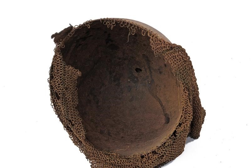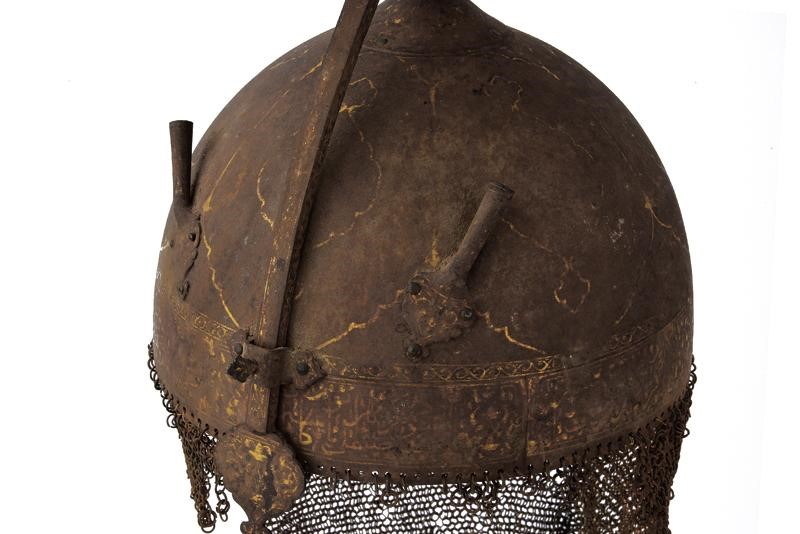 Coppo emisferico in ferro decorato con sottili linee, cartigli e disegni floreali in oro (mancanze), la parte inferiore con cartigli recanti iscrizioni in caratteri arabi (ancora ben visibili sul retro). La sommità cuspidata, con facce incavate e decorate in oro; la parte frontale con nasale scorrevole e due pennacchiere. Camaglio formato da piccoli anelli con chiusura semplice (mancanze). Elegante elmo in patina, da pulire.