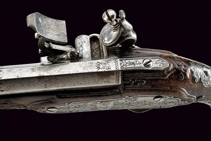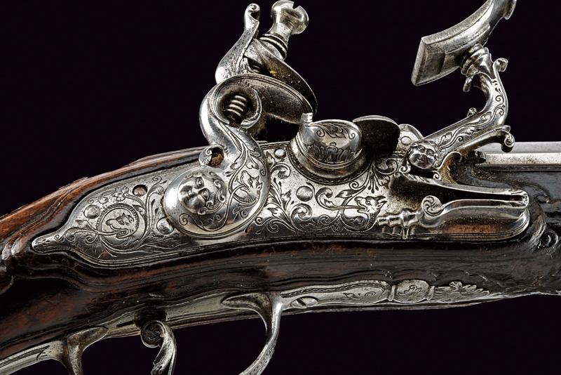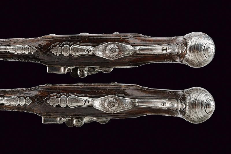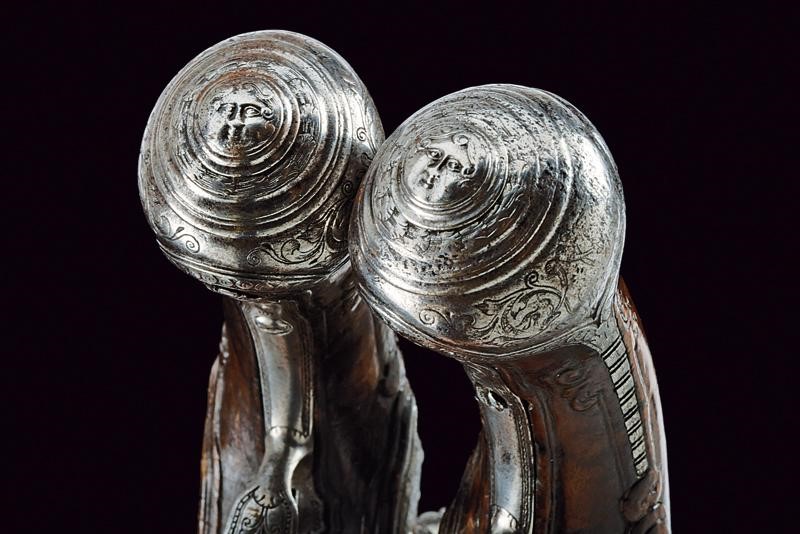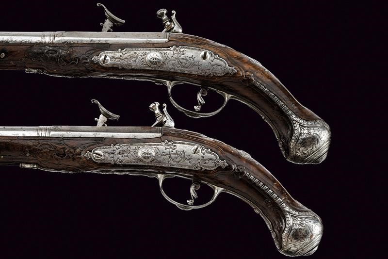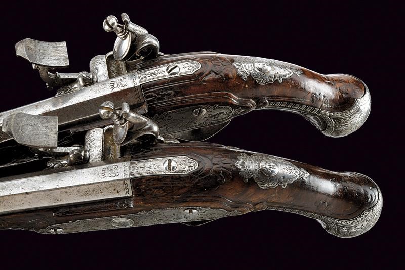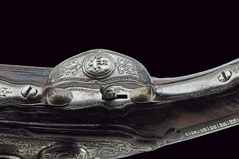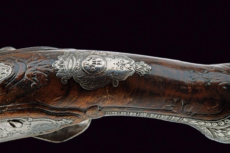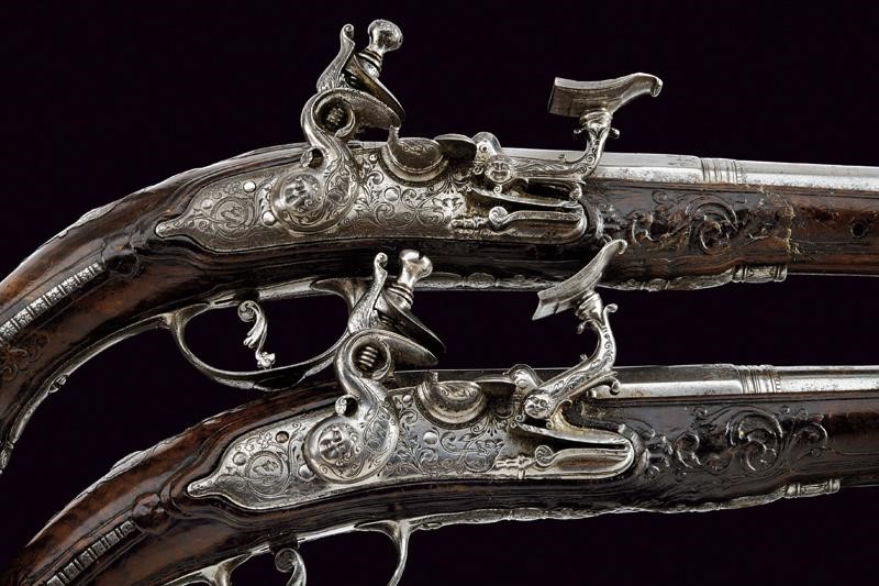 Canne lisce a due ordini con piccole incisioni e cornicette scanalate ai cambi. Sulle camere di scoppio la marca medicea coronata. Belle batterie "alla fiorentina", cartelle bombate con fini incisioni a fiorame, cani a collo di cigno, viti con mascheroni , siglate all'interno "CZ" per Cassiano Zanotti. Bei fornimenti in ferro con incisioni a tralci e fiorami, piccoli mascheroni intagliati in bassorilievo. Casse intere in noce bruno con tipici intagli "tosco-emiliani". Bacchette originali con cavastracci in ferro.