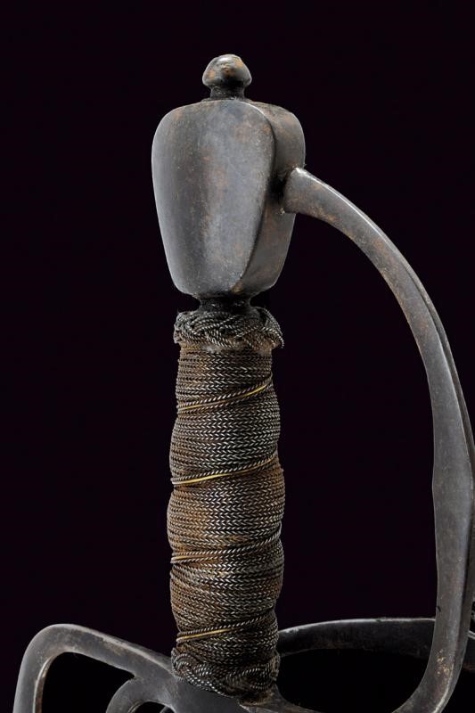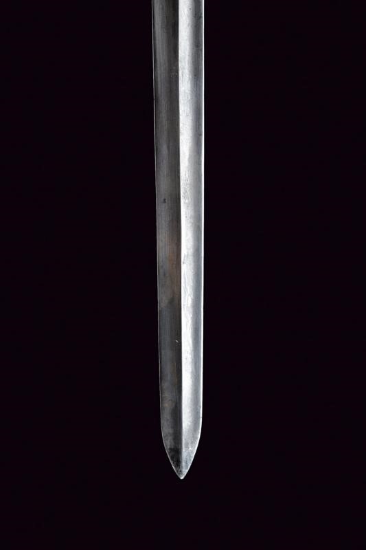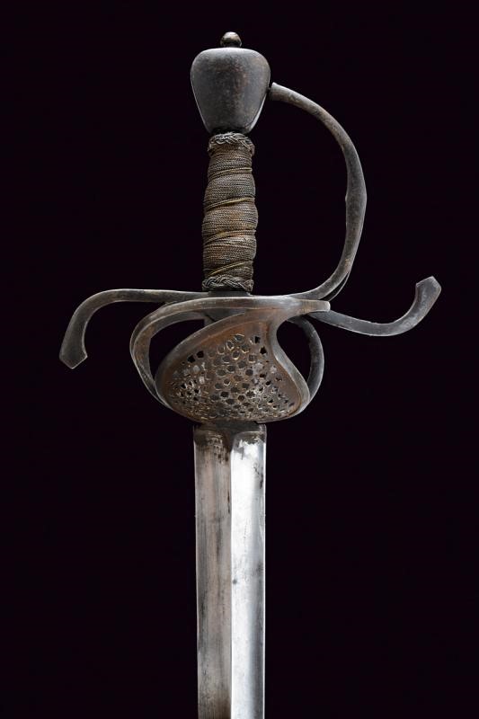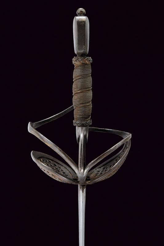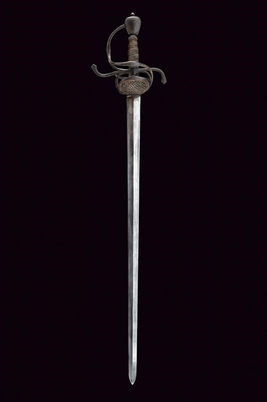 Lama dritta a due fili con nervatura centrale. Imponente fornimento in ferro con due valve riccamente traforate; quella anteriore di forma tonda, quella posteriore irregolare ed appuntita verso il lato destro. Elso a "S", il ramo di guardia con ramo di sostegno che parte dall'archetto sinistro. Pomo piatto crescente verso l'alto. Impugnatura in legno con bella trecciola e teste di moro in filo metallico.