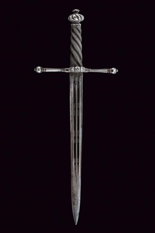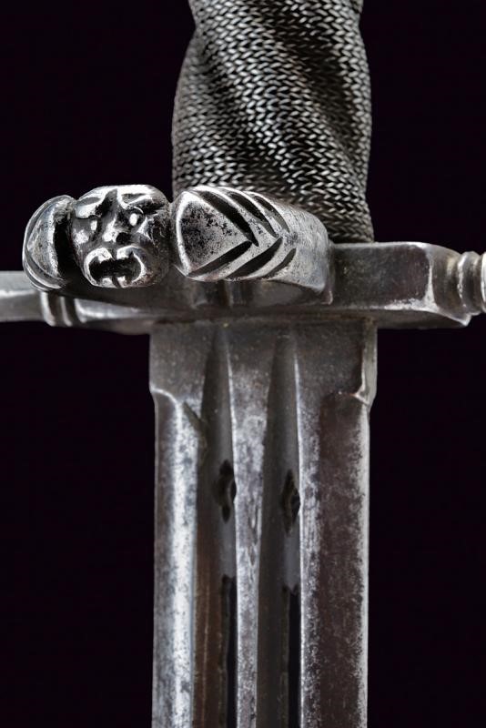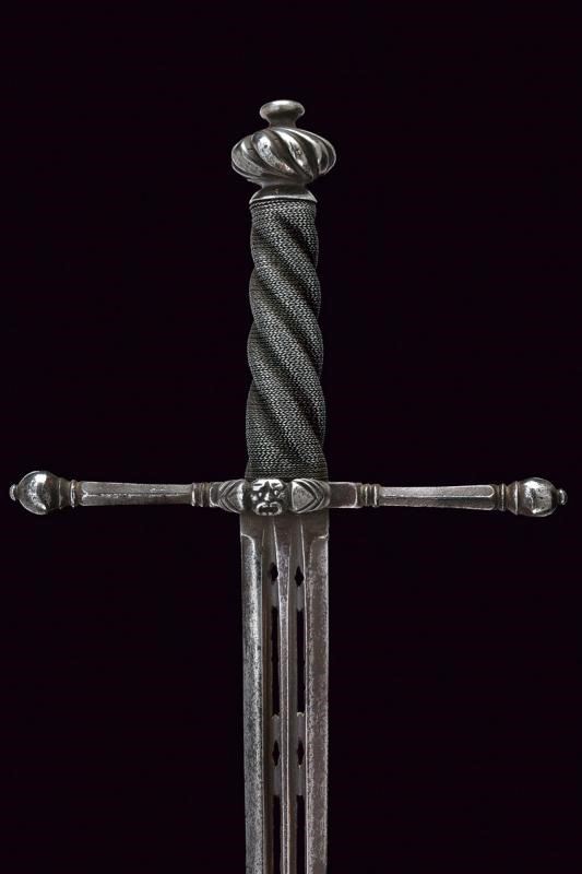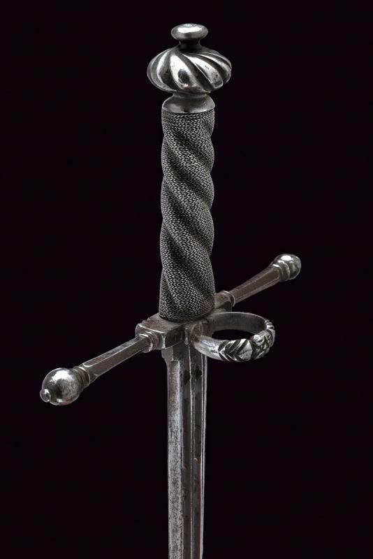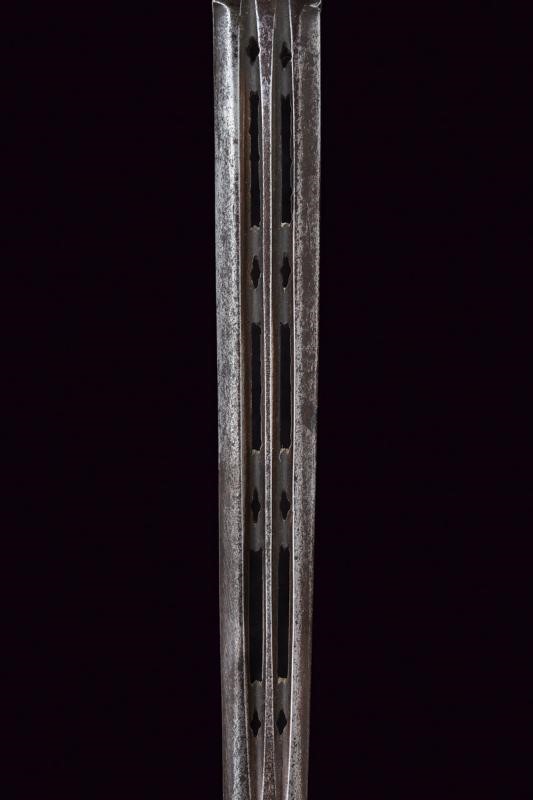 Lama dritta a due fili con duplice scanalatura riccamente traforata; fornimento in ferro con elso a bracci dritti, faccettati e con estremità a goccia. La sommità dell'anello intagliata con un piccolo mascherone. Pomo intagliato a turbante. Impugnatura in legno a spire rivestito di trecciola in filo di ferro.