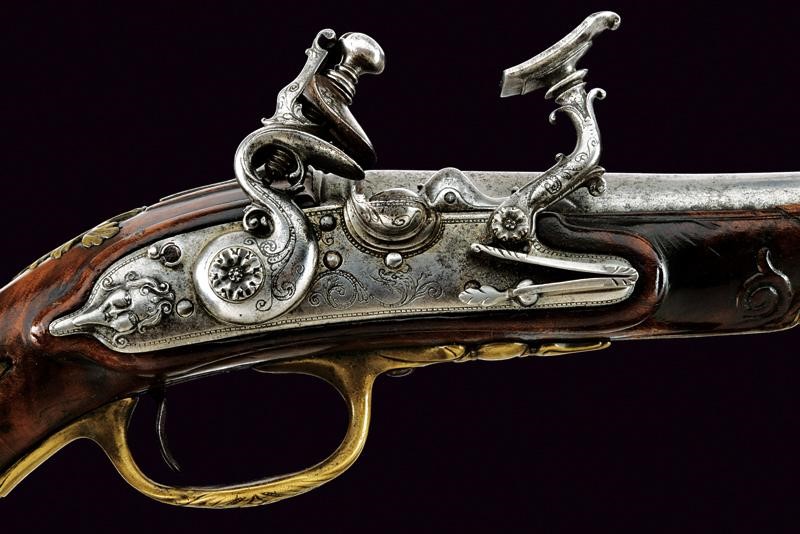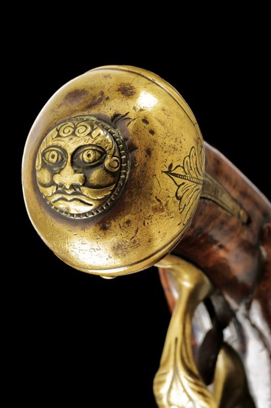 Canna rigata due ordini con base ottagonale poi tonda con bindella, le estremità con anellature, mirino in ottone, cal. 10.5 mm; codetta liscia munita di traguardo. Bella batteria incisa e con intagli in rilievo a serpenti, motivi floreali e con un drago; il bordo delineato e la codetta con mascherone, il copriscodellino scorrevole a forma di balena. Internamente la firma "Sabione". Cassa in legno leggermente scolpito (piccolissimi restauri). Bei fornimenti in ottone; la contropiastra con due draghi, il ponticello a motivi floreali e la coccia con mascherone in rilievo e con incisioni floreali. Bacchetta in legno con battipalla in corno.