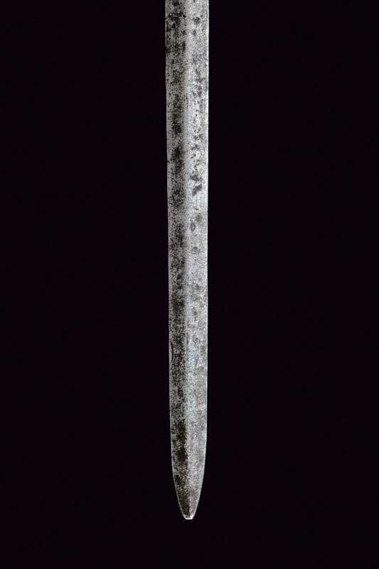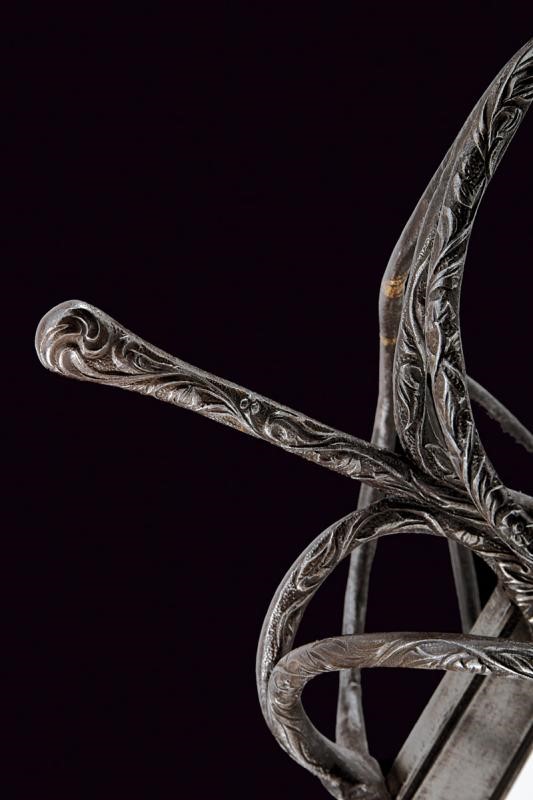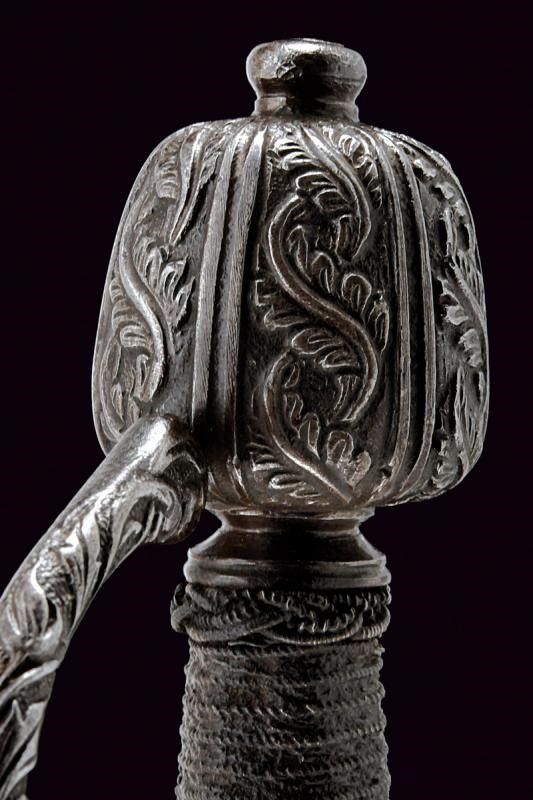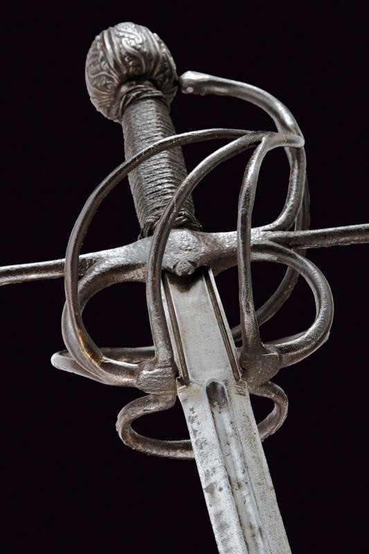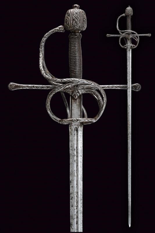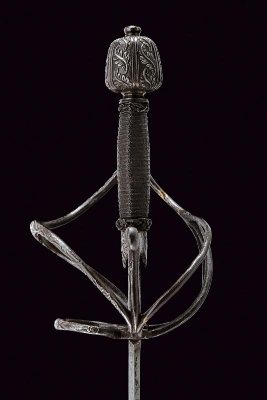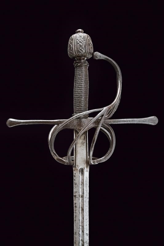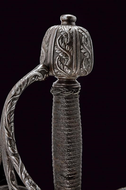Lama dritta a due fili con scanalatura alla base, lungo ricasso con sottile scanalatura ai bordi. Classico fornimento in ferro finemente intagliato a motivi floreali, il massello appuntito e con bel mascherone, il pomo decorato con bande longitudinali intagliate a fogliame alternate da scanalature. La parte posteriore liscia e con pitting. Impugnatura in legno rivestito di trecciola e con teste di moro in filo di ferro.