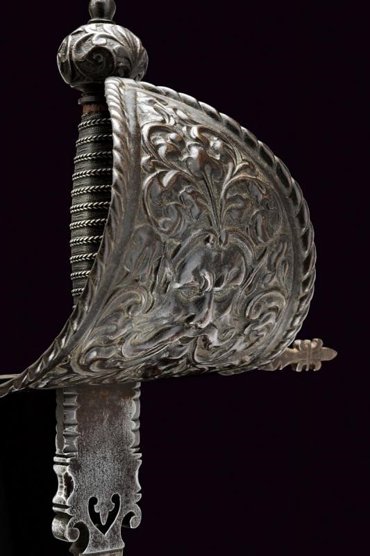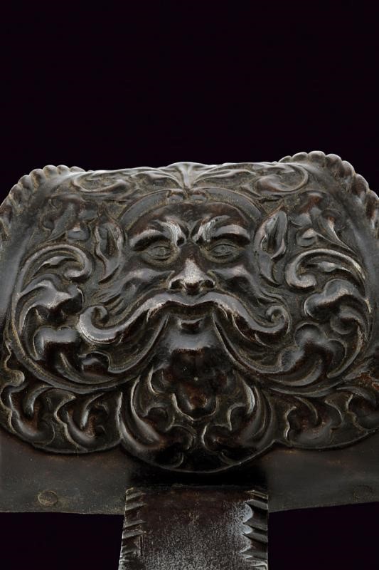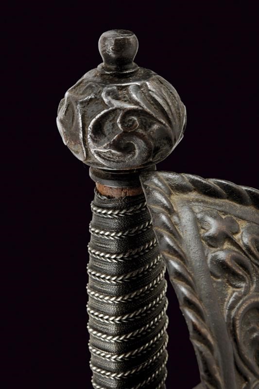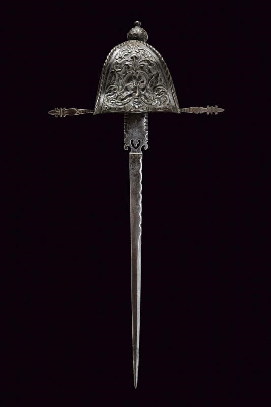 Lama dritta a un filo e controfilo, con tallone ingrossato, intagliato e traforato con un giglio, dotato di sguscio per il pollice sul retro. Fornimento in ferro con grande vela finemente intagliata con un mascherone fra decori floreali in rilievo, bracci dell'elso dritti incisi a motivi geometrici e con estremità a giglio, pomo sferico intagliato a motivi floreali. Finitura brunita. Impugnatura in legno rivestito con fine trecciola metallica.