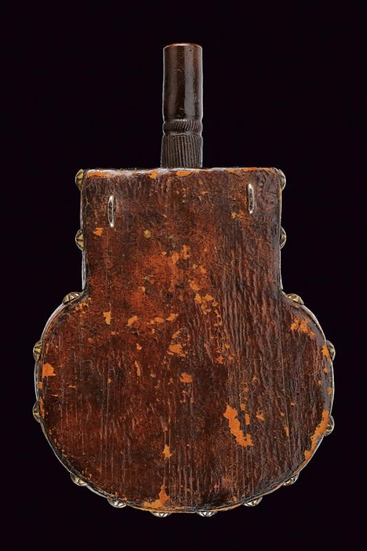 La base in legno con corpo in cuoio bollito ed inciso. Il collo decorato con un mascherone al centro fra motivi floreali e con una cornice lavorata a fingere il tortiglione. La parte inferiore assai sporgente a nove coste pronunciate, ciascuna lavorata a fingere il tortiglione. Il bordo decorato a rivetti a stella in bronzo. Il cannello cilindrico, sempre in cuoio. Sul retro due anelli di sospensione in ferro. Molto rara.