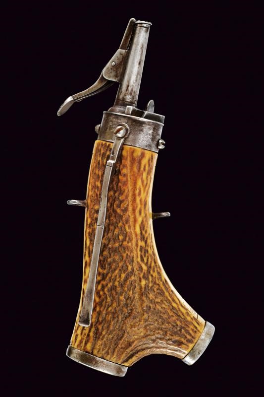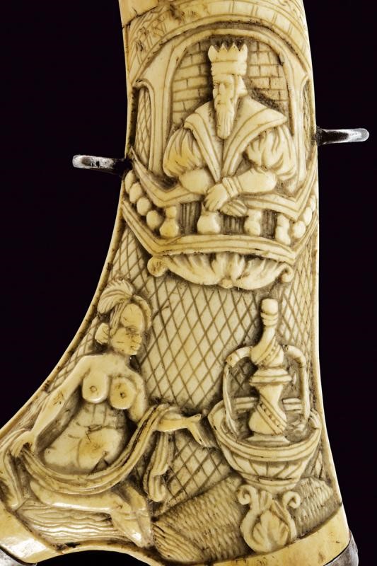 Corpo in corno di cervo a base biforcata, la parte anteriore finemente scolpita in rilievo raffigurante un re che osserva dal suo balcone una figura muliebre svestita intenta a lavarsi. Fornimenti in ferro, il cannello ed il dosatore a molla, quest'ultimo parzialmente intagliato a conchiglia. Due anelli di sospensione e un gancio da cintura.