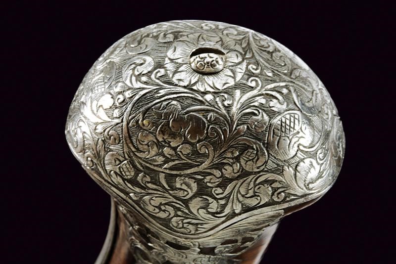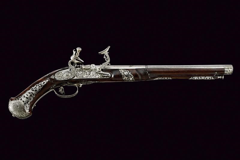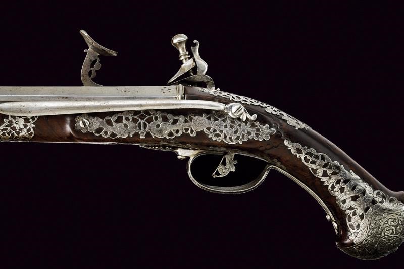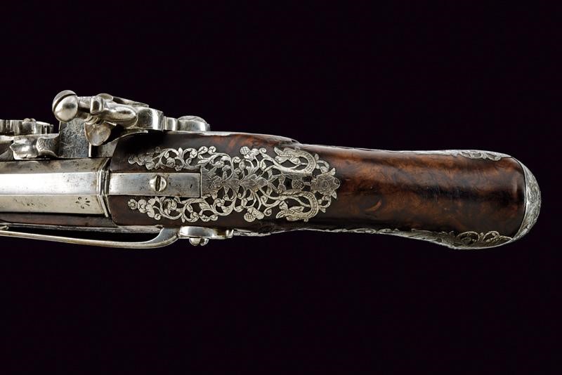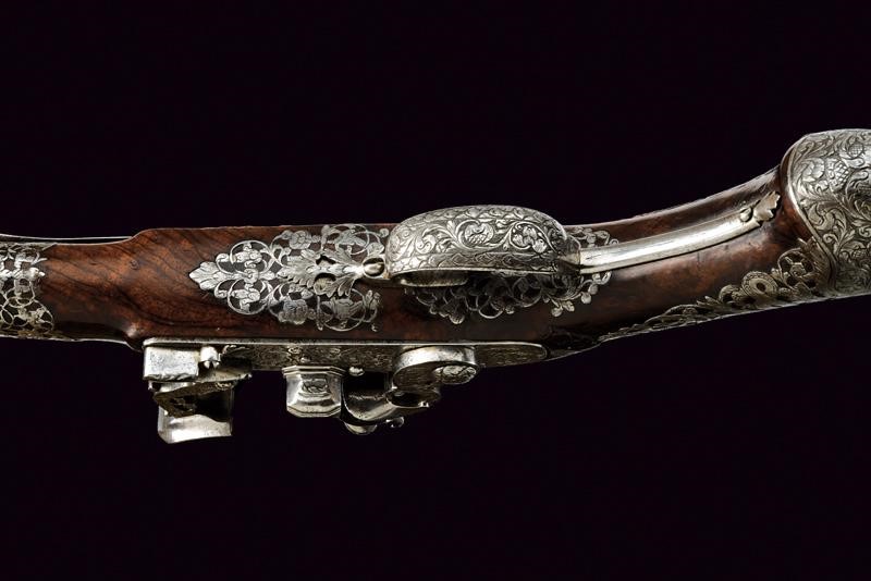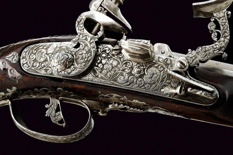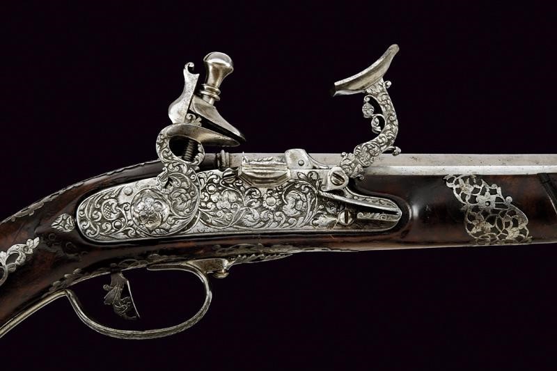 Canna liscia a due ordini, prima ottagonale, con cornice alla base e con un giglio inciso, poi a sedici facce con anellatura al cambio e con un altro giglio in volata, cal. 15.5 mm. Lunga batteria a pietra focaia con cartella piatta riccamente incisa e intagliata, cosi come il cane e la martellina, a motivi floreali; copriscodellino scorrevole, anche questo inciso. Cassa intera in legno (piccola crepa), leggermente scolpita e dotata di bellissimi tarsie in acciaio copiosamente traforate ed incise con serpenti a motivi floreali. Ponticello e coccia decorato en suite con la batteria. Il grilletto e i due fornimenti reggibacchetta finemente traforati. Gancio da cintura. Bacchetta in legno con battipalla in ferro.