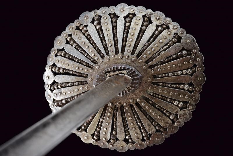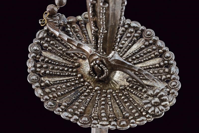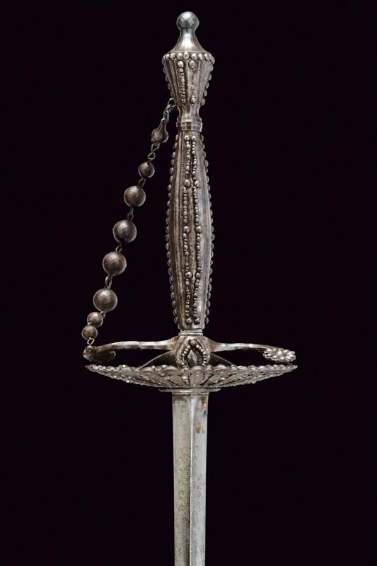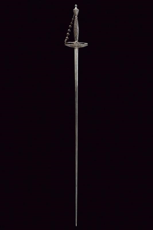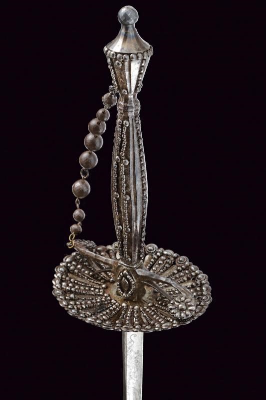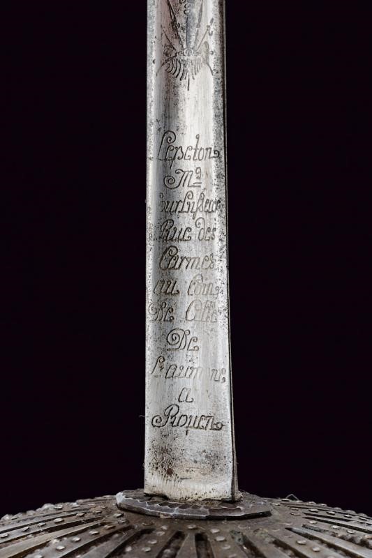 Lama di sezione triangolare con facce incavate; la prima parte incisa a trofei e a motivi floreali, la base con marcatura di un armaiolo di Rouen. Fornimento in ferro con coccia ellittica, traforata a raggi e riccamente decorata, come tutto il resto, con innumerevoli perline d'acciaio. Completa di catenella con sfere faccettate.