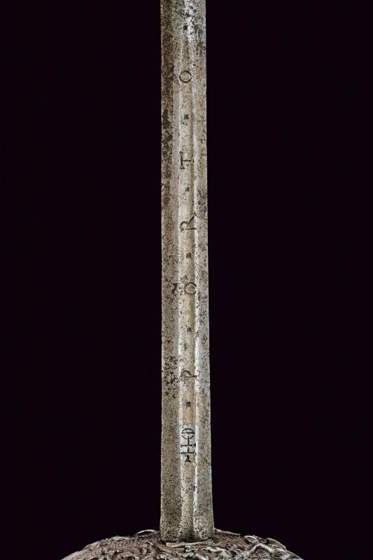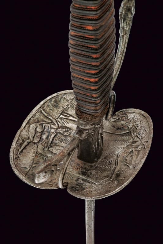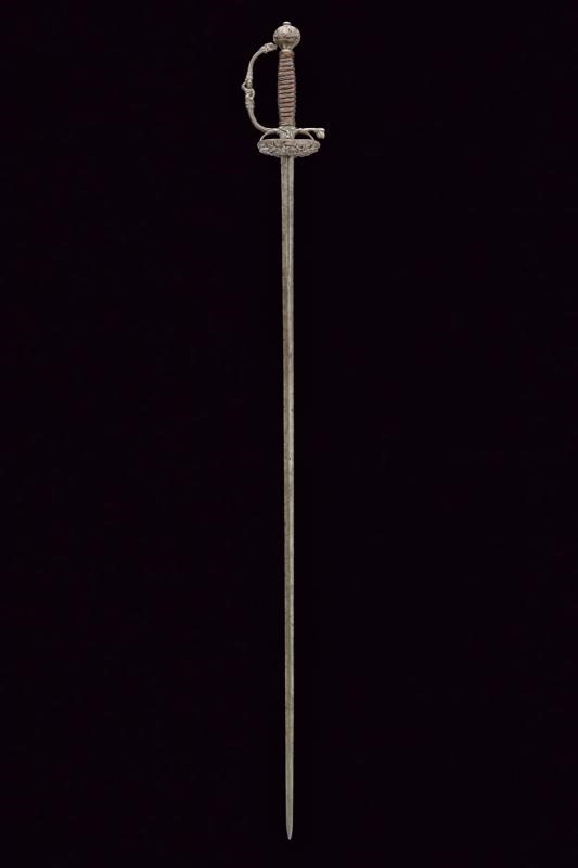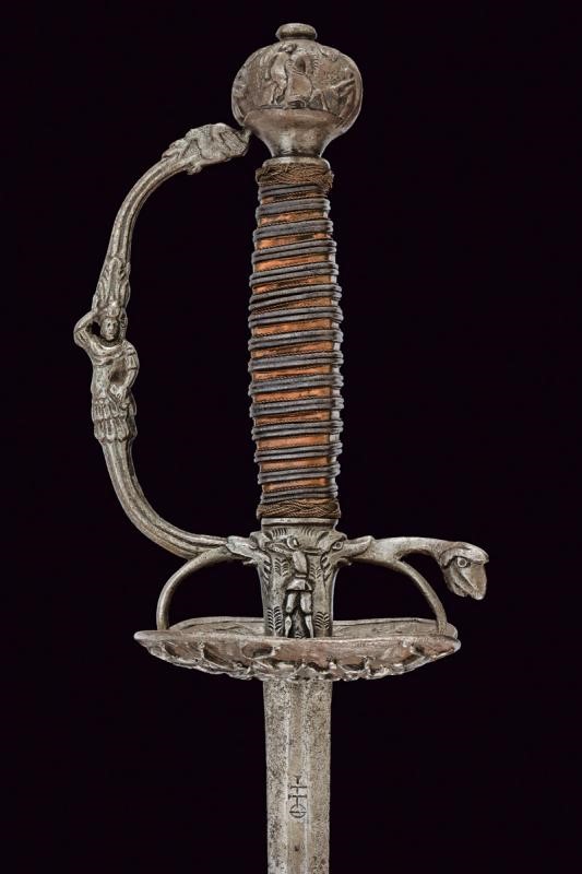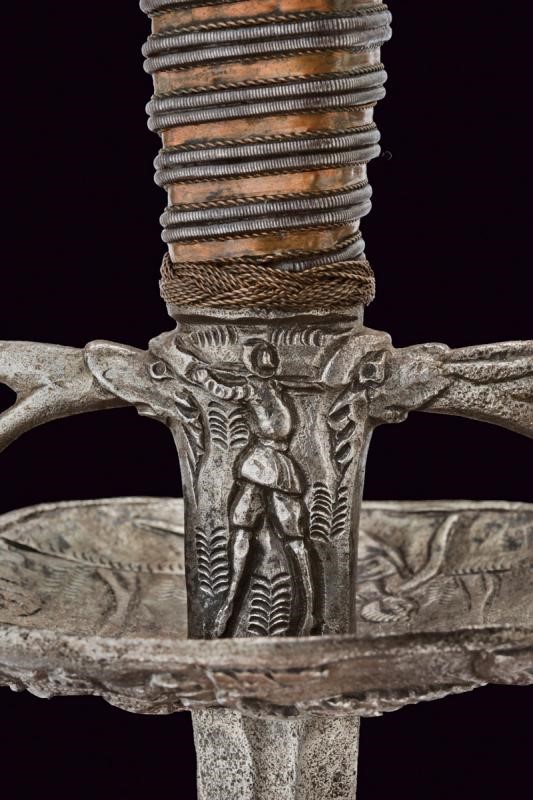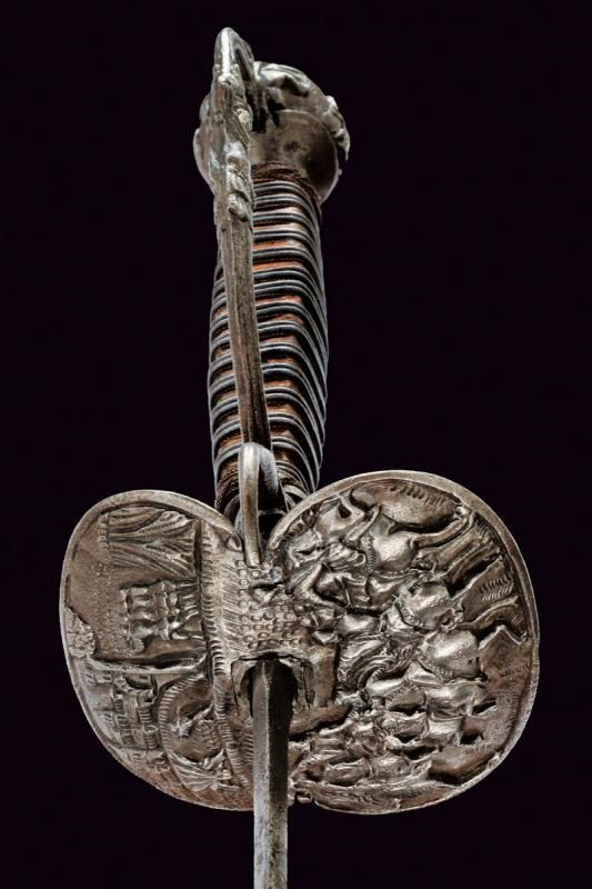 Lama dritta di sezione lenticolare, a due fili (qualche intaccatura), recante al forte un marchio su entrambe le facce e la dicitura "P.O.R.T.O." all'interno dello sguscio. Fornimento in ferro. Coccia a due valve, lavorata in rilievo con una scena di assedio: in primo piano un gruppo di uomini d'arme a cavallo ben rilevati, al centro la raffigurazione stilizzata di truppe in formazione con picchieri, sullo sfondo gli edifici di una città e alcuni soldati vicino ad un accampamento. Il massello con un guerriero stilizzato, la guardia con una cariatide al centro lavorata a tuttotondo (in armatura all'antica); il pomo con truppe in marcia. Impugnatura con trecciola in ferro e teste di moro in rame.