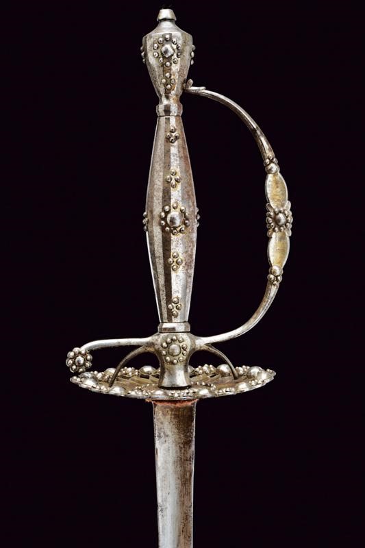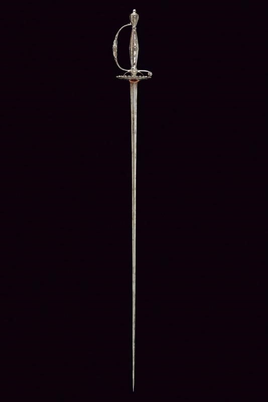 Lama dritta di sezione triangolare con facce incavate. Fornimento in ferro massiccio con coccia ovale, traforata al bordo e, come il resto del fornimento, riccamente decorata con perline d'acciaio.