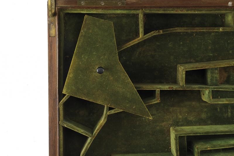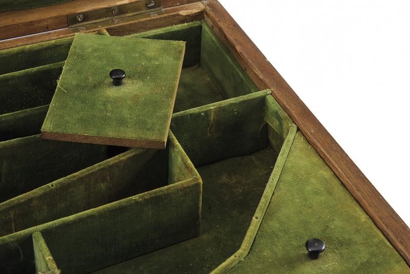 Bella cassetta in legno con ovalino in ottone sul coperchio, interno rivestito in velluto verde con alloggiamenti per pistole e per gli accessori, scomparti con pomellini in ebano. Alloggiamenti per pistole lunghezza 52 cm. Reca impressa in oro su velluto la marca del fabbricante " 26 Boulevart des Italiens - DEVISME - Arquebusier Bréveté".