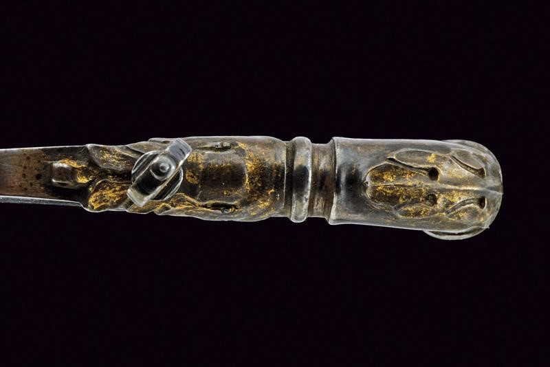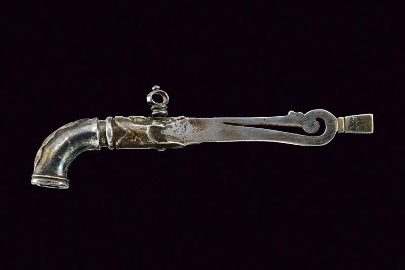 In ferro. Di forma allungata. Un'estremità con traforo a ricciolo e cacciavite. L'altra con intagli a grottesche e anellature. Al centro piccolo passante snodato. Su un lato resti di argentatura e doratura.