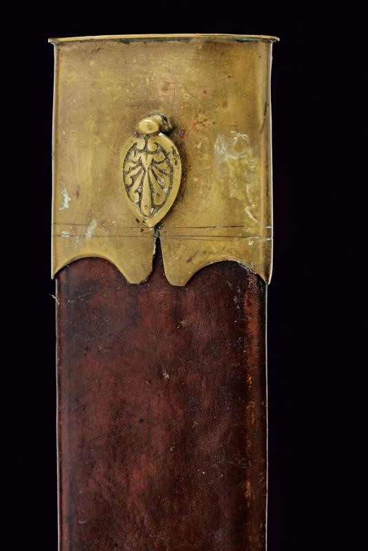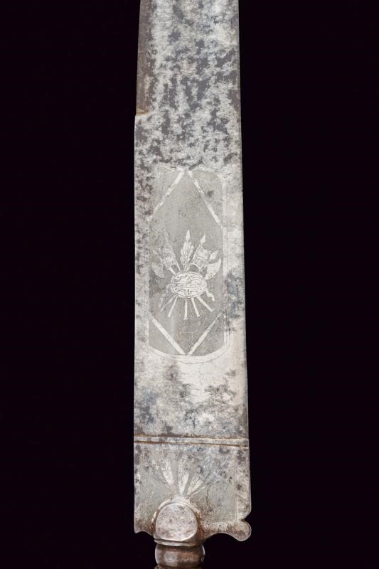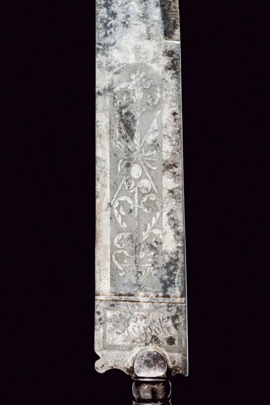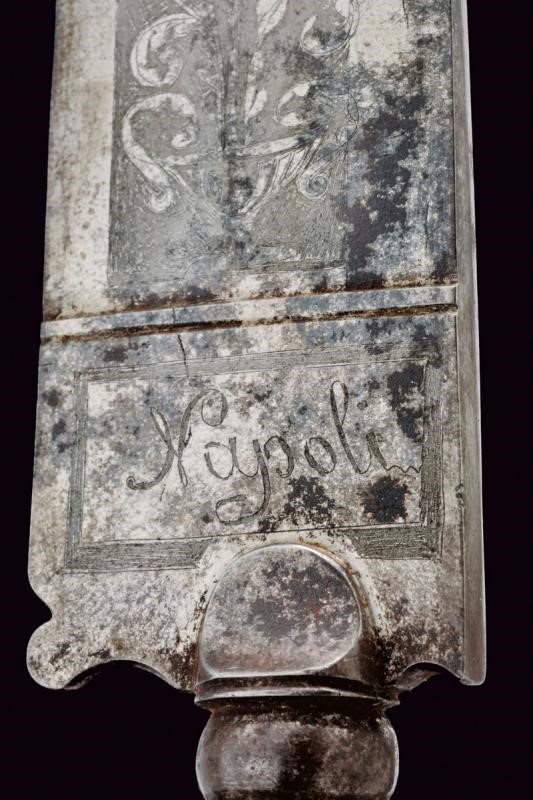 Larga e robusta lama a un filo e controfilo, incisa all'acquaforte a trofei e motivi floreali su sfondo grigio, la base marcata "Napoli". Impugnatura (piccolo restauro) in corno di cervo, il pomo scolpito a testa di volatile, il bottone in ferro diamantato. Completa di fodero in cuoio marrone con fornimenti in ottone.
