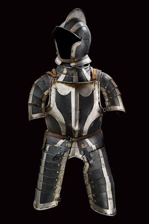 Borgognotta con coppo realizzato in due metà congiunte alla cresta che è di media altezza. La tesa aguzza in un unico pezzo con il coppo, la gronda a lama singola tenuta da ribattini. I guanciali molto probabilmente coevi. Interessante il punzone ben marcato sulla tesa. L'elmo è ornato a bande rilevate color ferro su fondo annerito con vernice bitumata (rinfrescata in epoca più recente?). I guanciali presentano un raro sistema di chiusura a passante metallico. Gola a spalletti, con padiglioni a tre lame, il lato anteriore recante lo stesso punzone dell'elmo. Gli spalletti a cinque lame ciascuno, entrambi completi, quello sinistro con alcune lame parzialmente distaccate. Anche le spalle ornate a bande color ferro su campi anneriti. Il petto con tapul ben accentuato, guardascella mobili, cordoni lavorati a fingere il tortiglione, la falda a due lame. Le scarselle d'epoca ma spaiate, una a sette lame una a sei. Anche questi ultimi elementi con decoro bianconero. Su un busto ligneo di supporto.