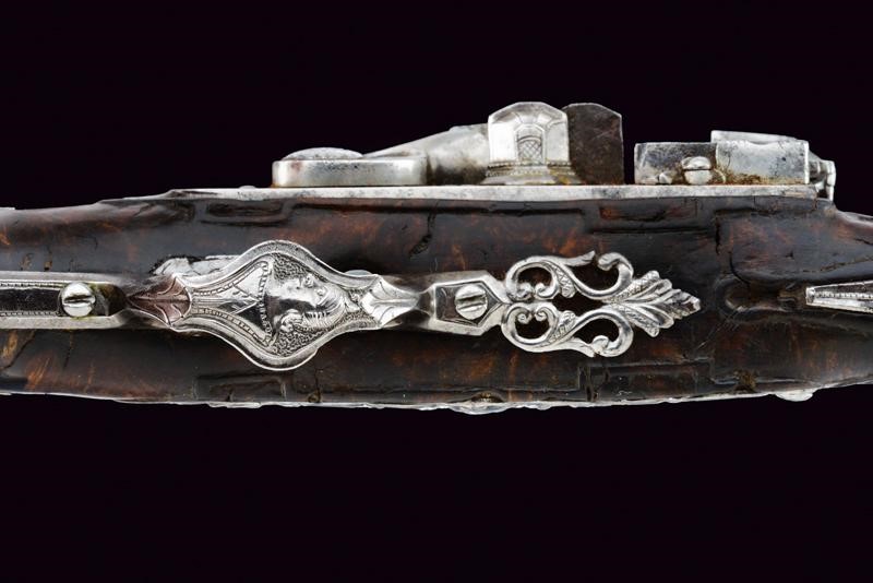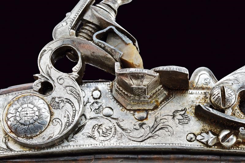 Canna liscia a due ordini decorata con anellature alle estremità; la prima parte ottagonale incisa a motivi floreali, la seconda parte tonda, con volata cal. 8 mm; codetta incisa, la vite coperta con un piccolo mascherone intagliato. Batteria a cartella piatta incisa ed intagliata a motivi floreali, dotata di copriscodellino scorrevole. Cassa in radica leggermente scolpita e con piccole mancanze e difetti. Bellissimi fornimenti in acciaio intagliato e parzialmente traforato; la contropiastra con medaglione recante un busto femminile tra fiorami, il ponticello e la coccia con busti ed incisioni floreali, il dorso con busto tenuto da due figure grottesche. Bacchetta in ferro munita di battipalla e cavastracci.